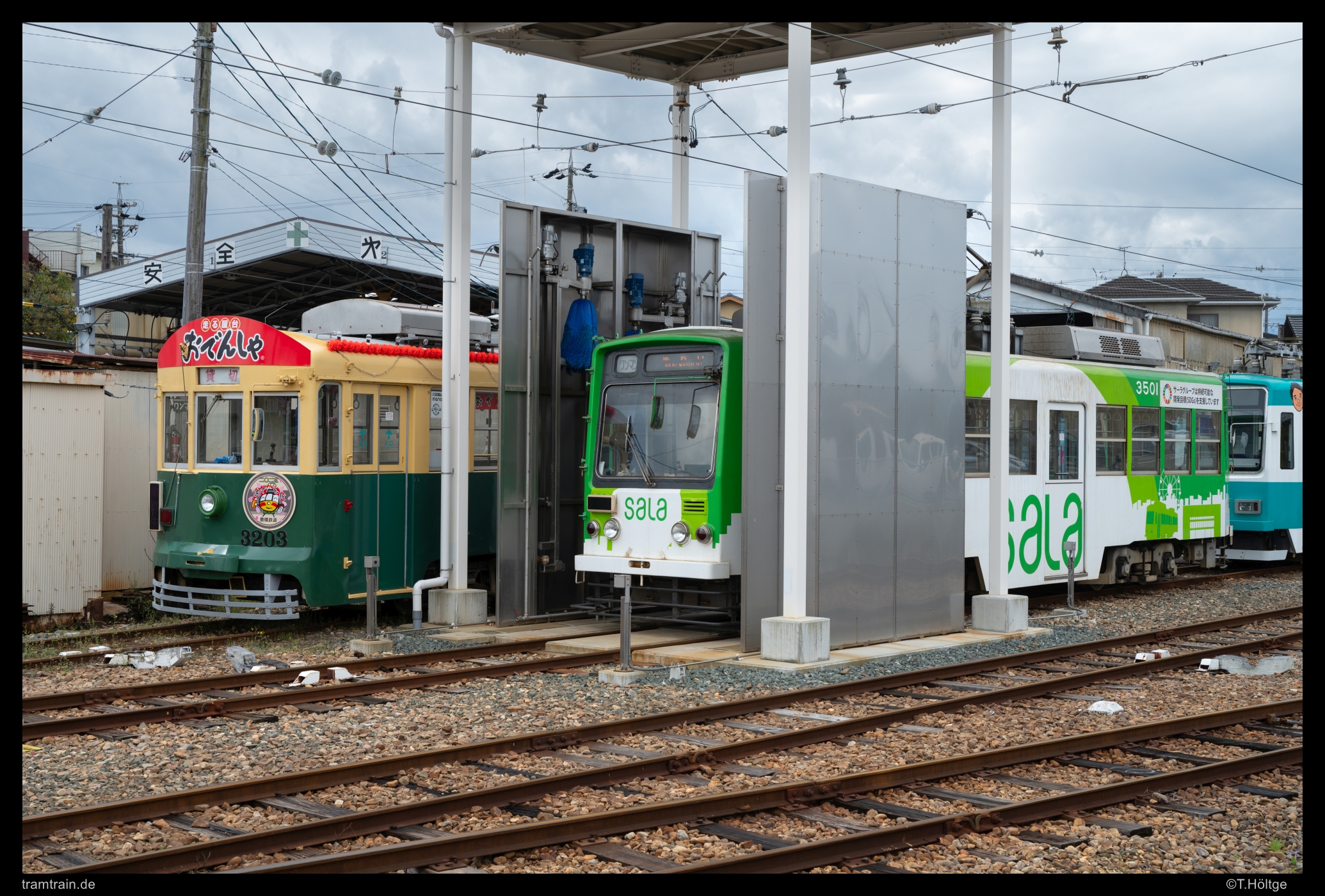 Auf dem recht gut einsehbaren Betriebshof Akaiwaguchi versteckte sich leider ausgerechnet der noch für Sonderfahrten betriebsfähige Wagen 3203 ein wenig.