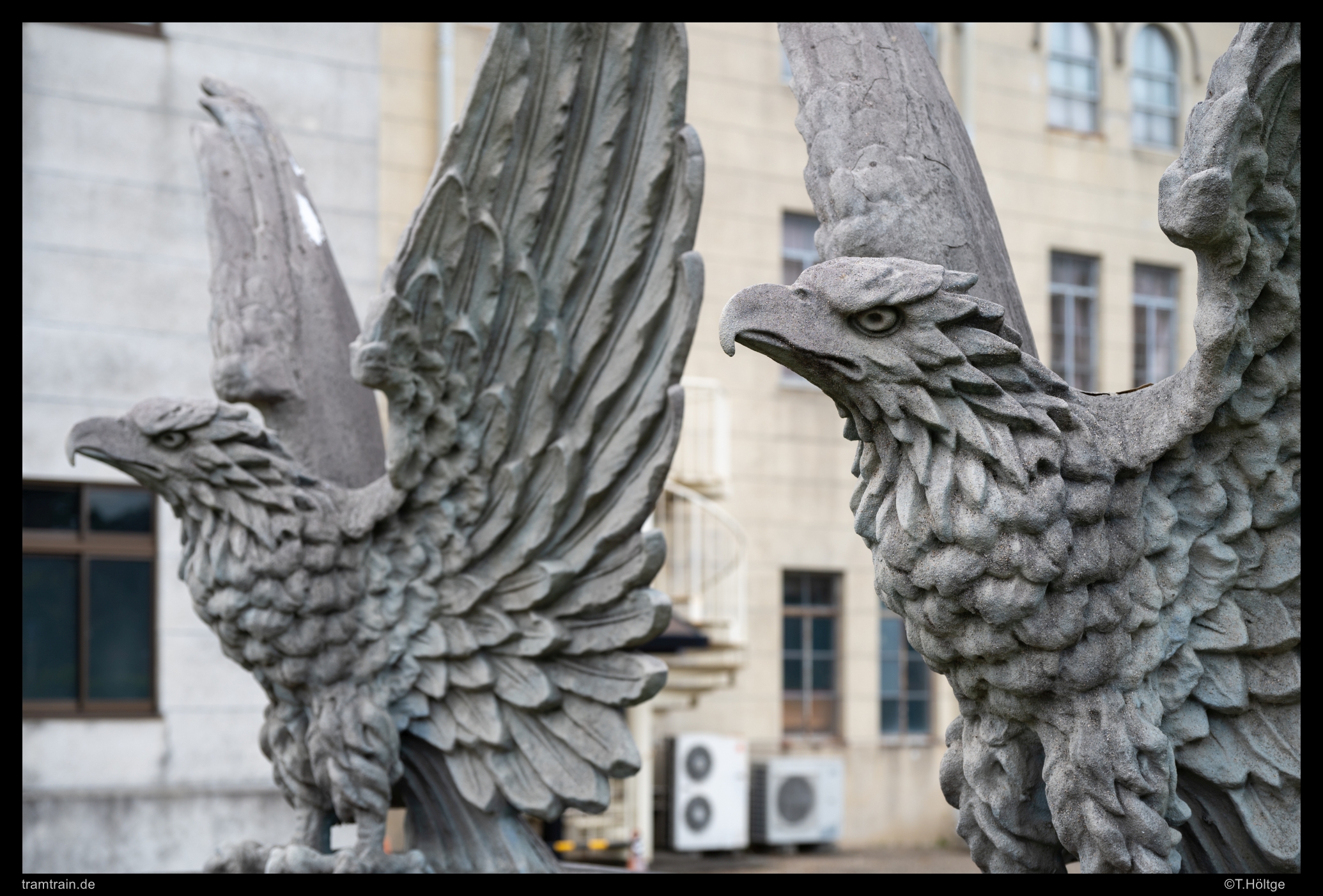 Neben der City Hall steht ein Paar mürrisch dreinblickender Adler.