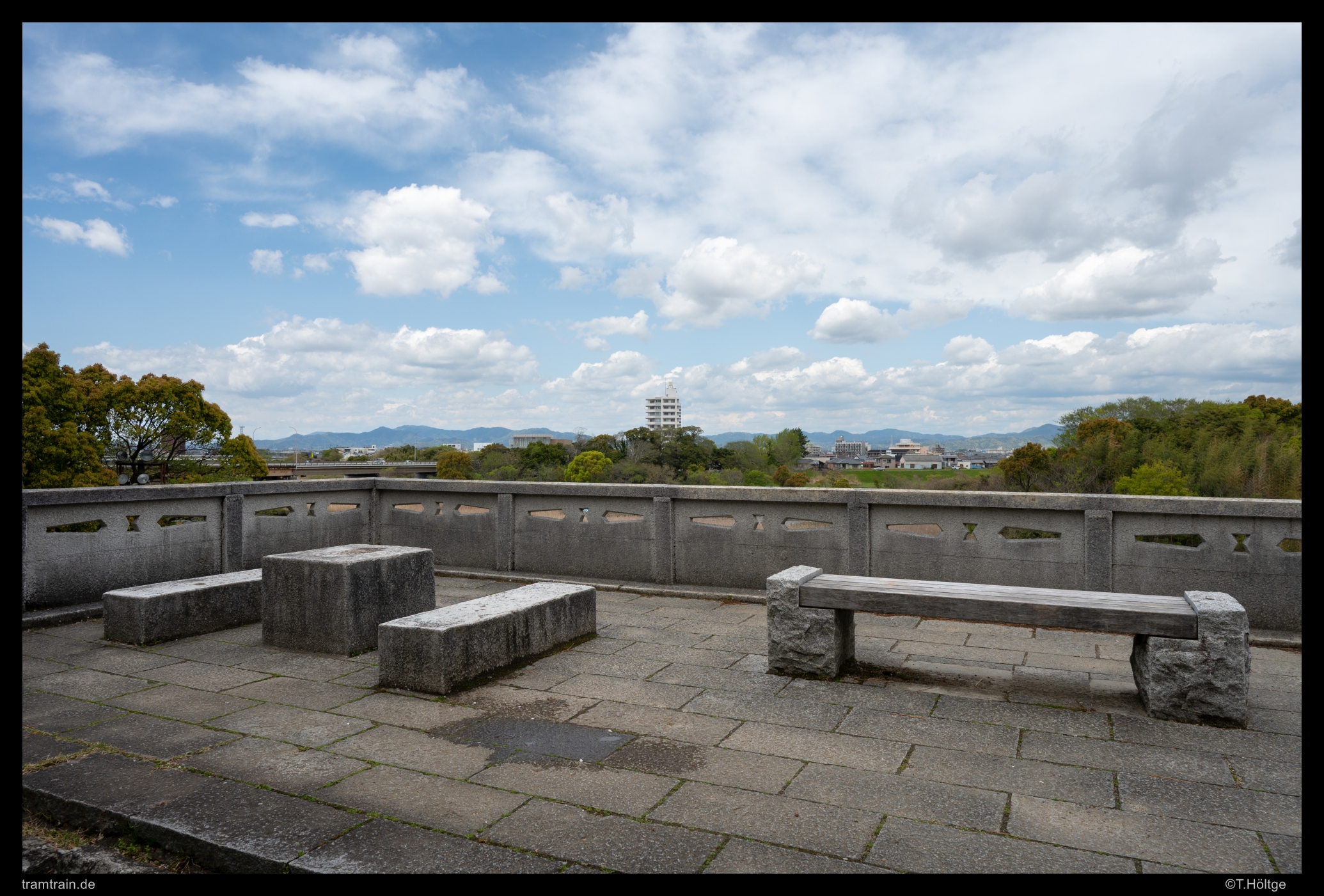 Wir vertrödelten gerade eigentlich weiterhin nur die Zeit, bis endlich die eben schon am Horizont sichtbaren Aufhellungen bei uns waren, um wenigstens nicht ganz ohne Sonnenbilder aus Toyohashi abzuziehen. Also gingen wir mal in den kleinen Park hinter der City Hall. Wirklich eindrucksvoll war das nicht, ebenso wenig wie die kleine Burg Yoshida, die sich ganz hinten im Park oberhalb des Toyokawa-Flusses befindet. Hatten wir das auch gesehen 😀