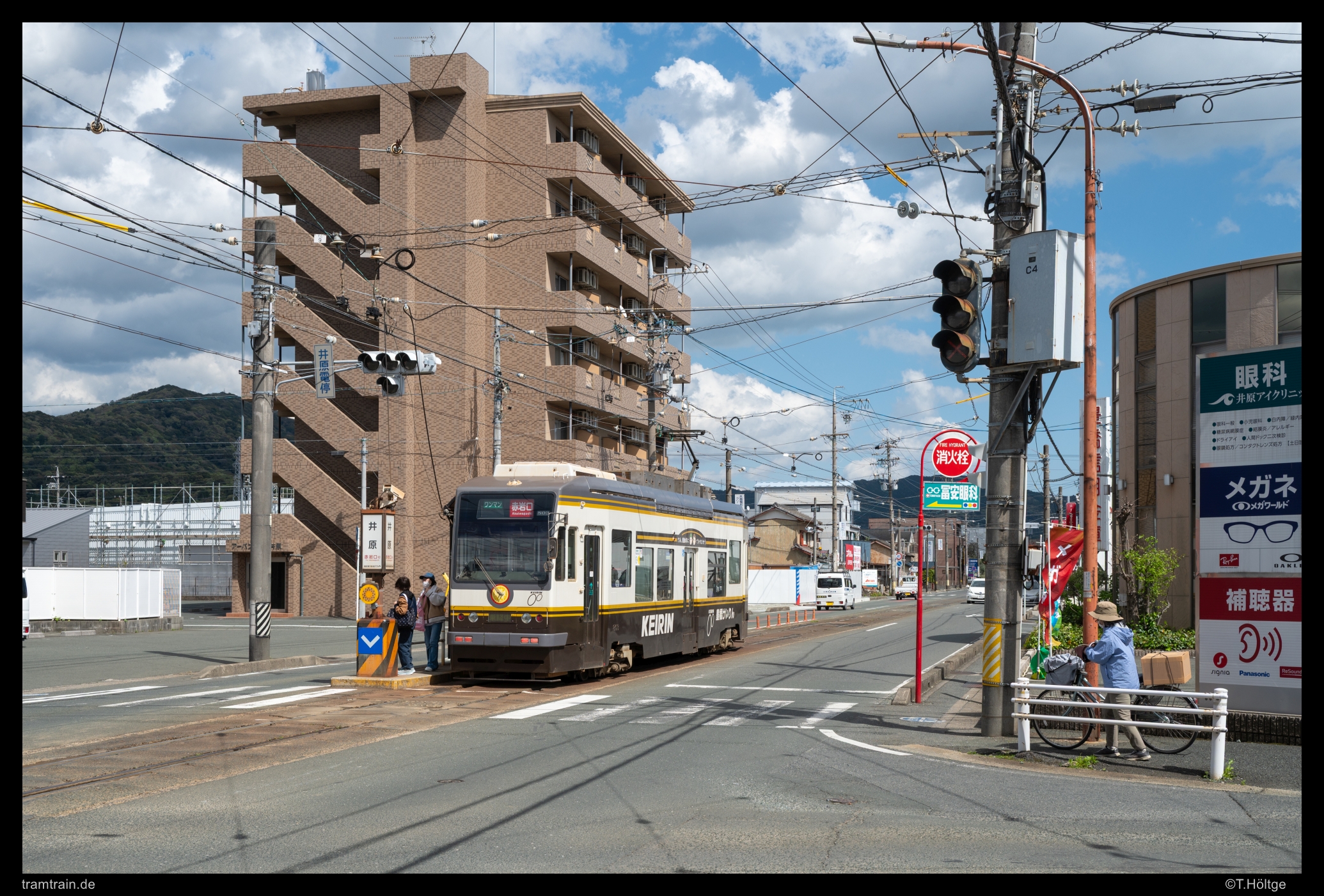 1001 hat den eingleisigen Abschnitt geräumt und 786 kann in die Haltestelle Keirinjo-mae einfahren. Links lugt Wagen 783 aus dem Abstellgleis.