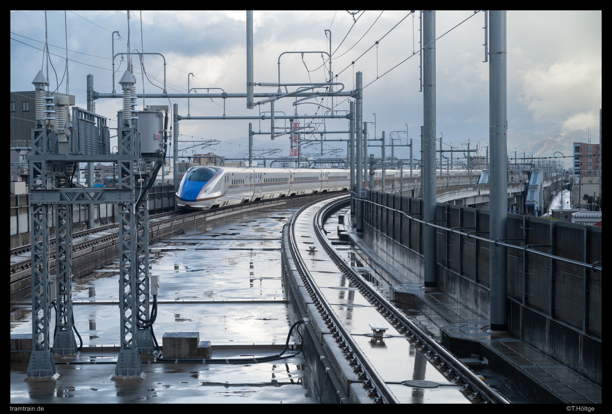 Ausfahrt unserer Baureihe E7 aus Fukui. Aus meiner Sicht von den aktuellen Baureihen optisch eine der schönsten. Im Südwesten, wo wir zu Beginn dieser Reise herkamen, sind die langweiligen N700 wirklich eine Seuche.
