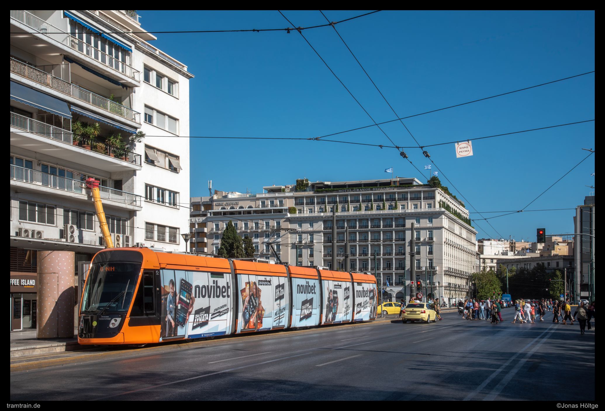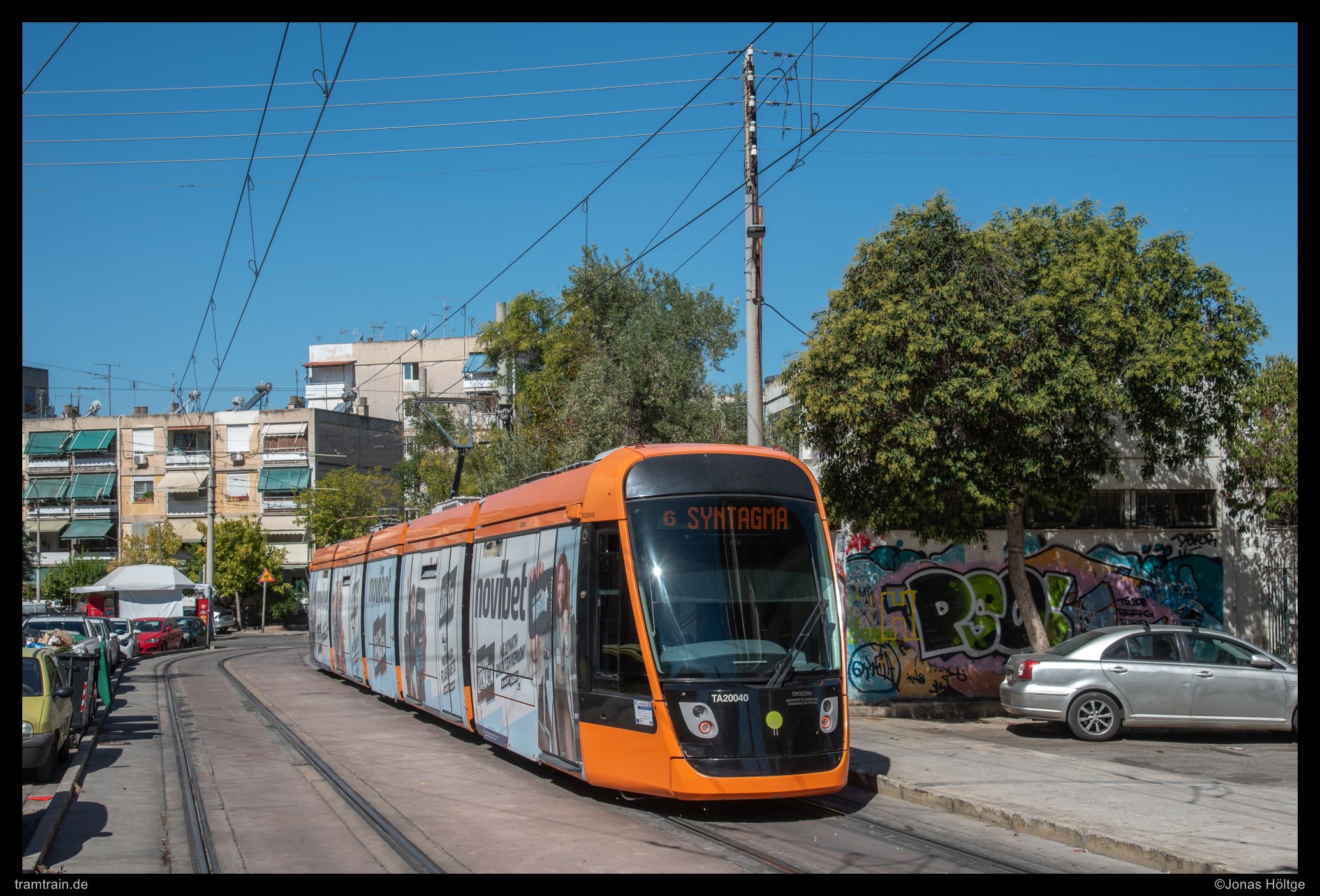 Werbewagen 20040 war gerade an der Endstation Syntagma angekommen und hatte sich auf dem straßennäheren Gleis eingefunden. Nachdem ich eine ganze Welle an Autos durchgelassen hatte, eröffnete sich der Blick auf den Wagen auch frei, sodass ich ein erstes Bild schießen konnte.