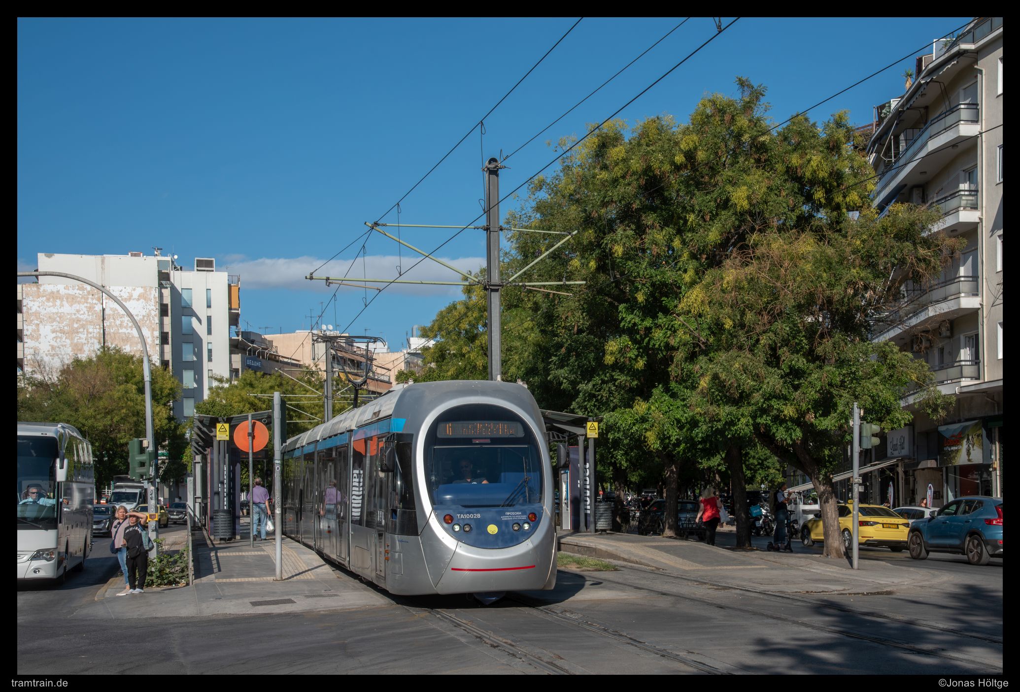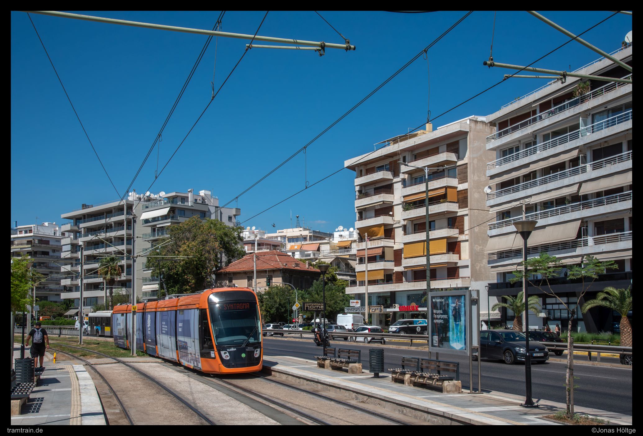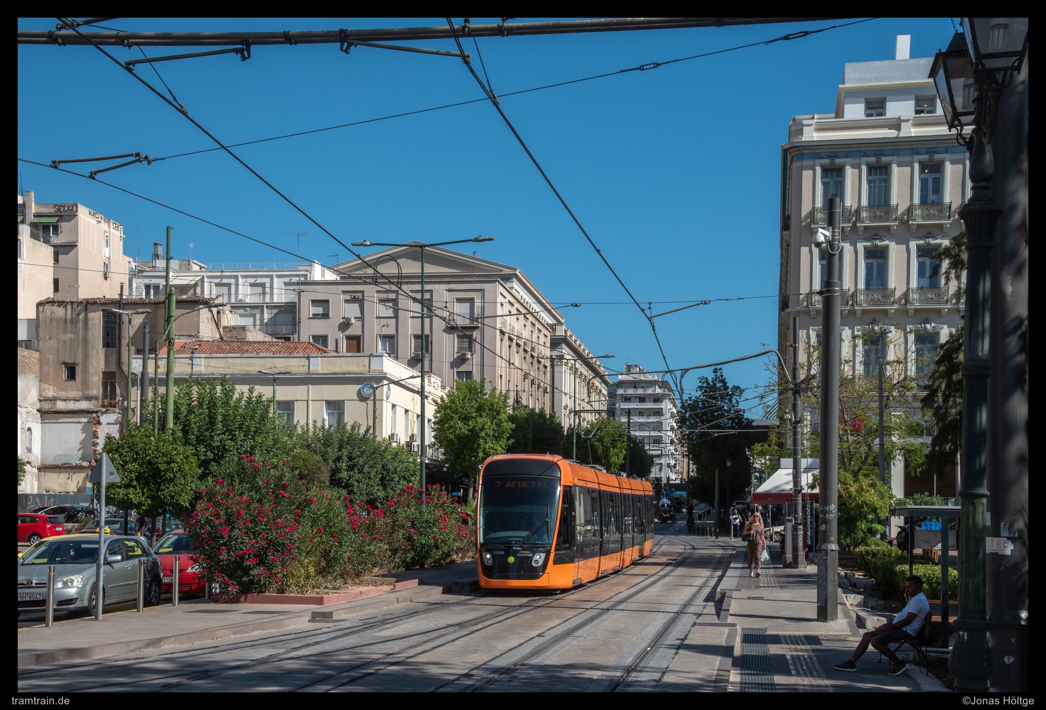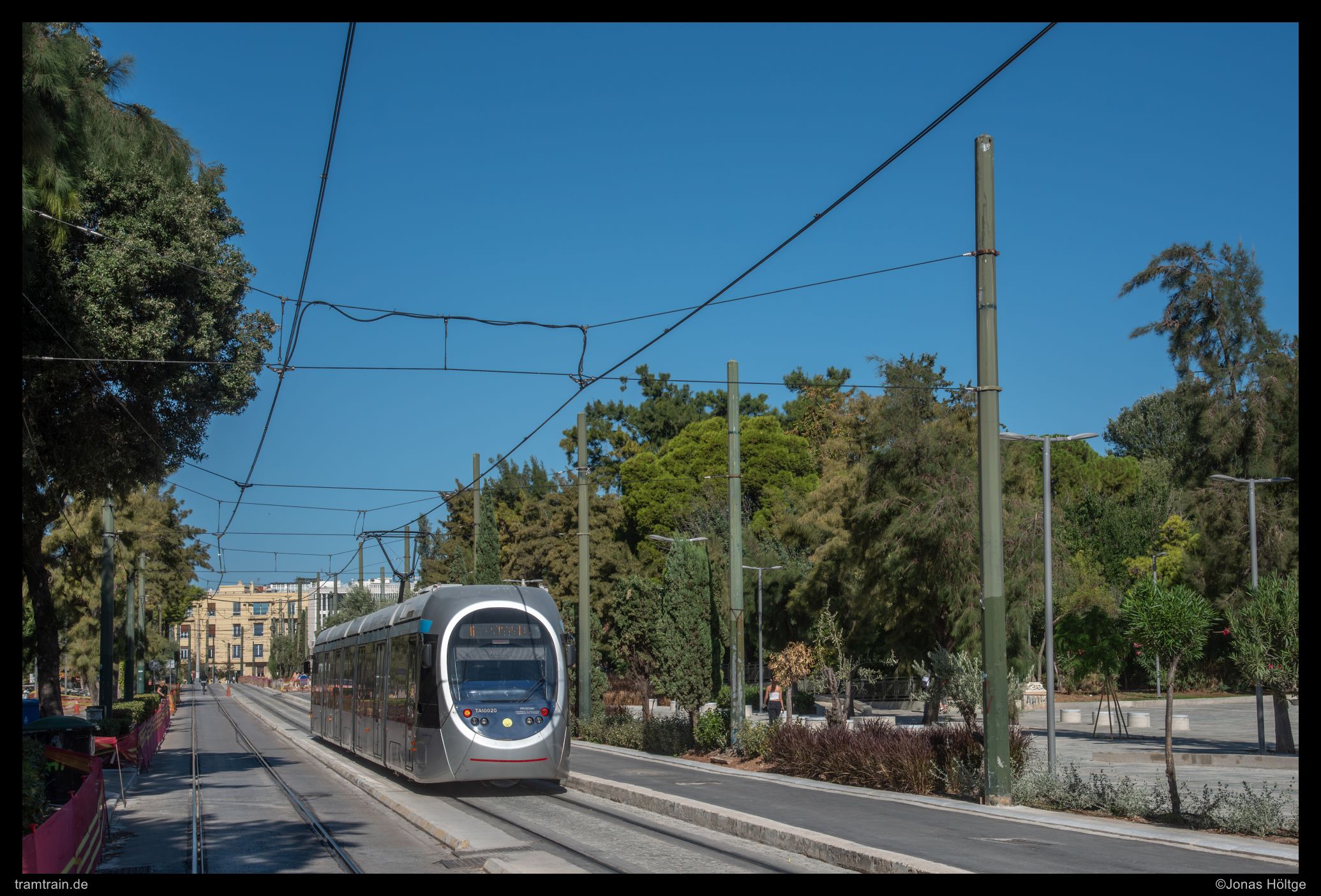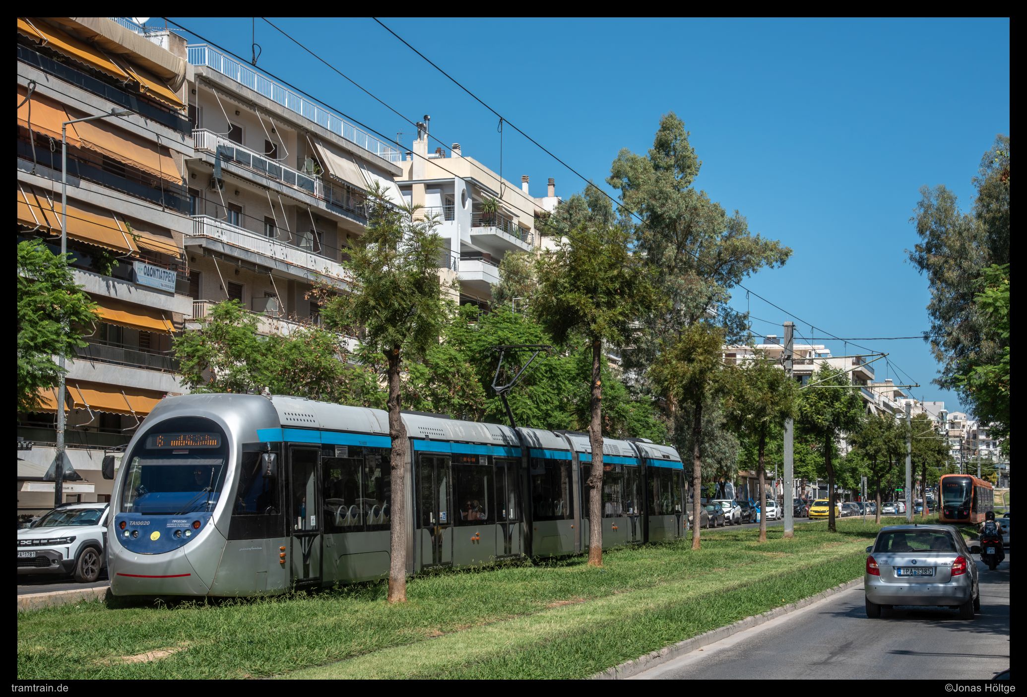 Zuerst versuchte ich es hinter der Haltestelle Agías Phōtrinés-Plateía mit einem Nachschuss. Doch dabei begleiteten Autos die Bahn direkt daneben. Daher wartete ich einen Kurs von vorne ab. Bei Wagen 20040 befanden sich zwar auch Autos auf der rechten Fahrbahn, diese störten aber nicht so immens, wie sie es beim Nachschuss zuvor getan hatten. So entstand ein erstes Bild an der langen Gerade, die die Straßenbahn hier in Straßenmitte bewältigte.