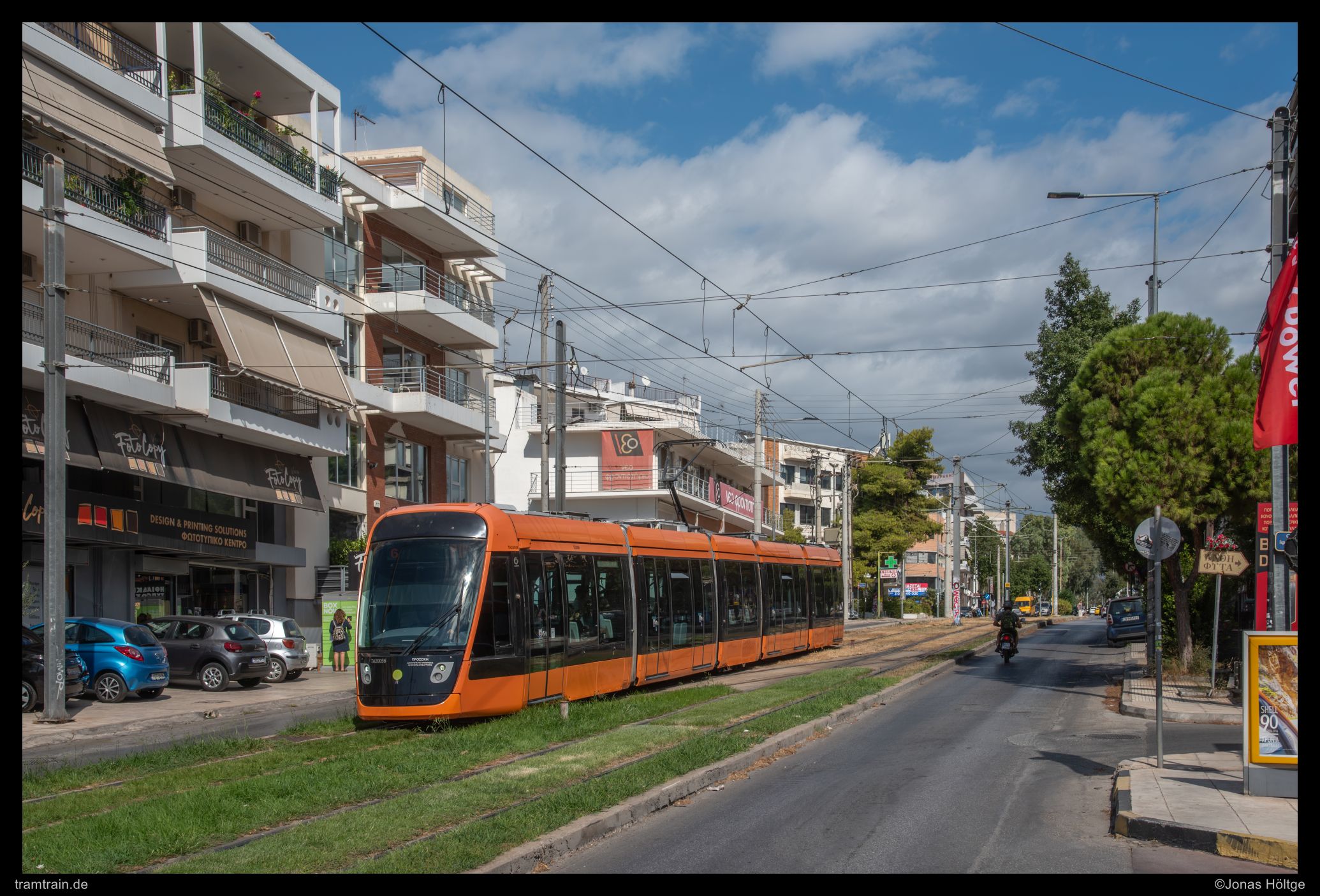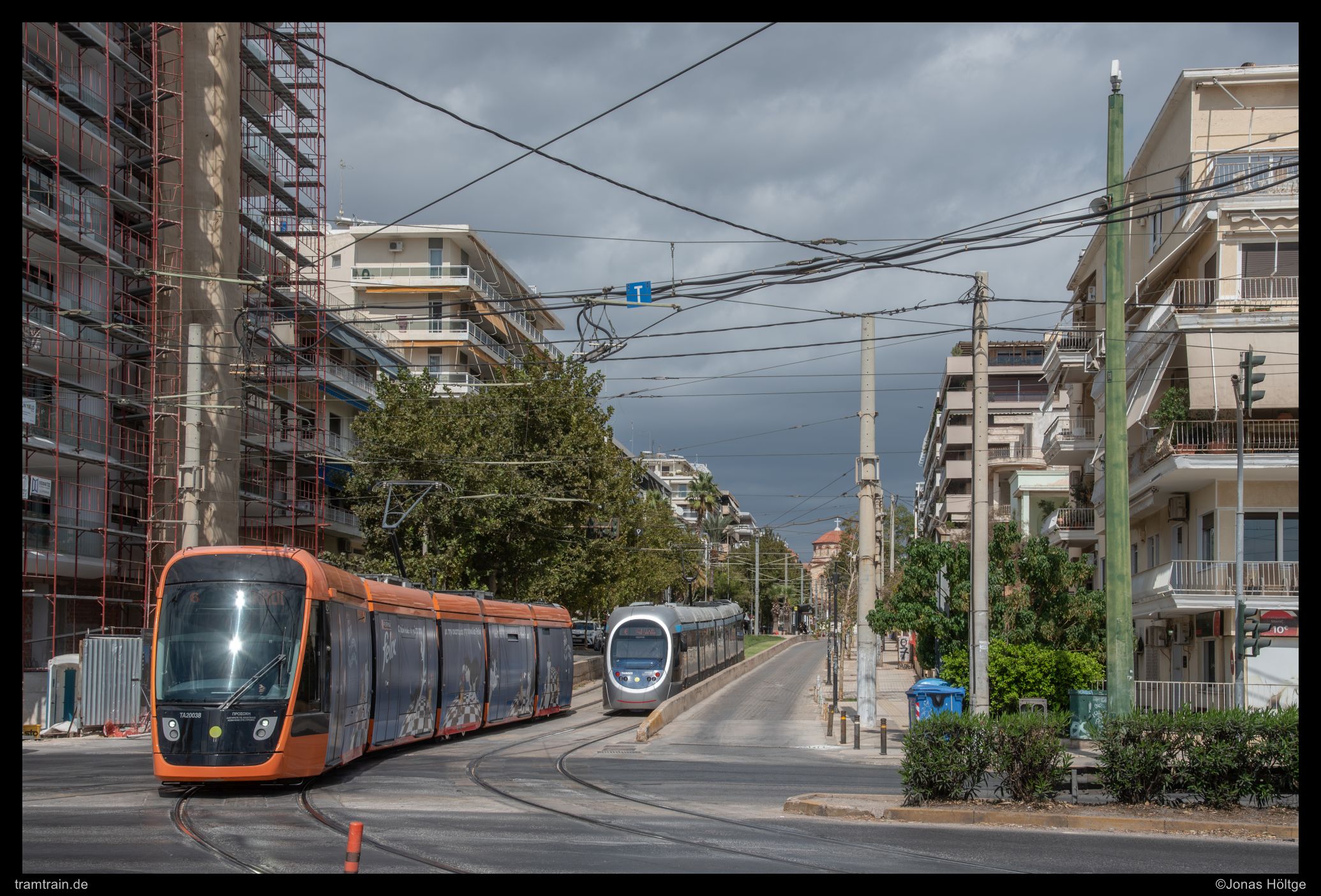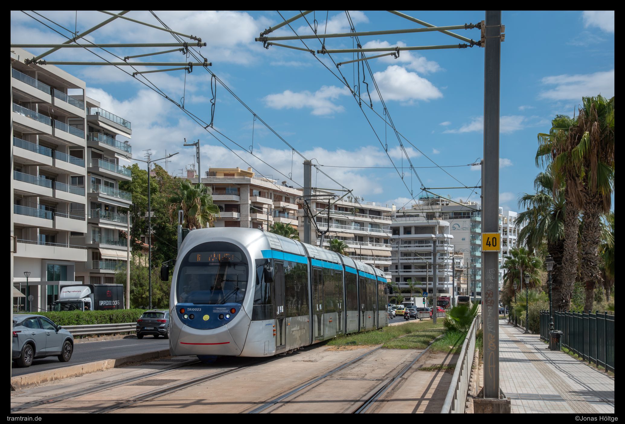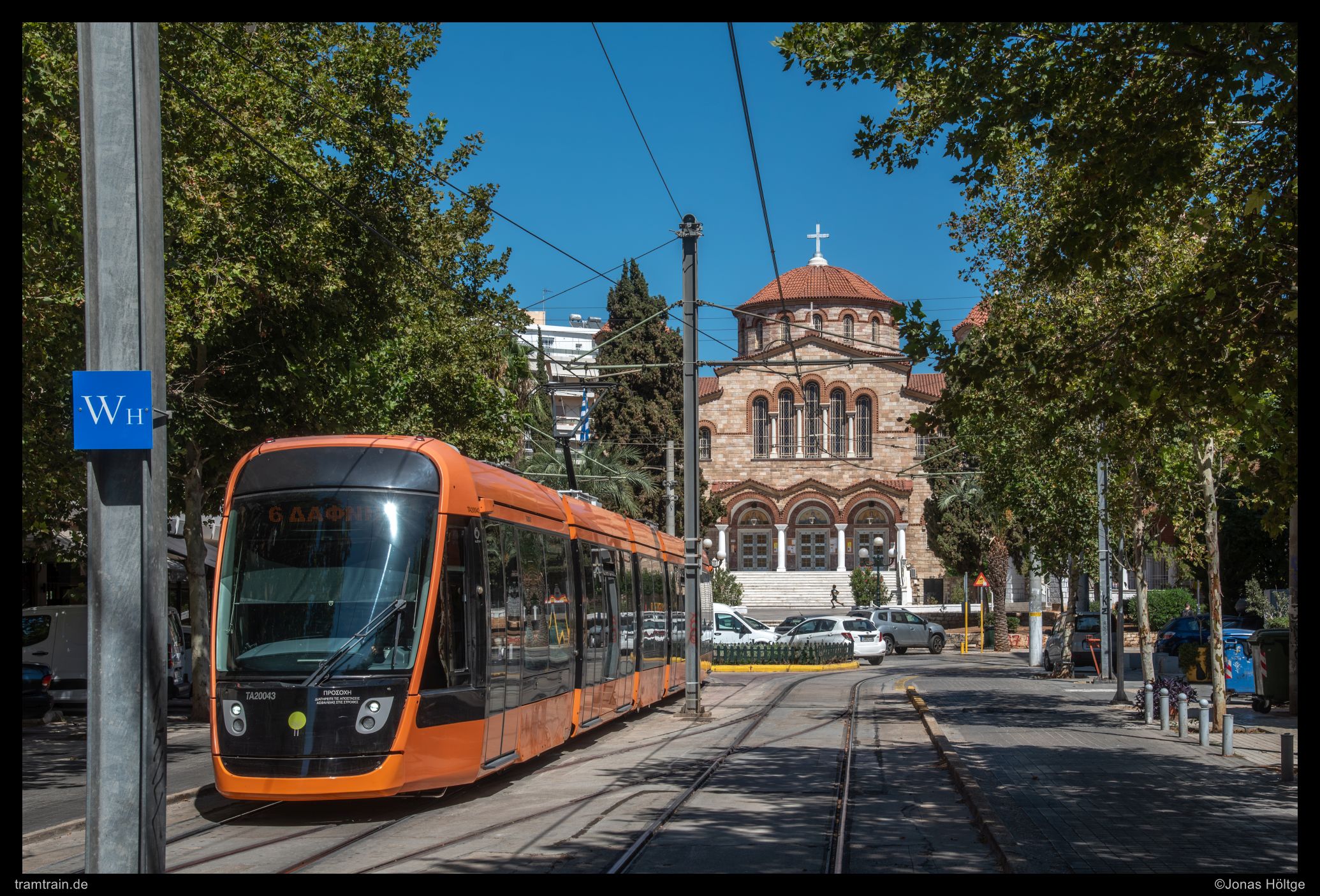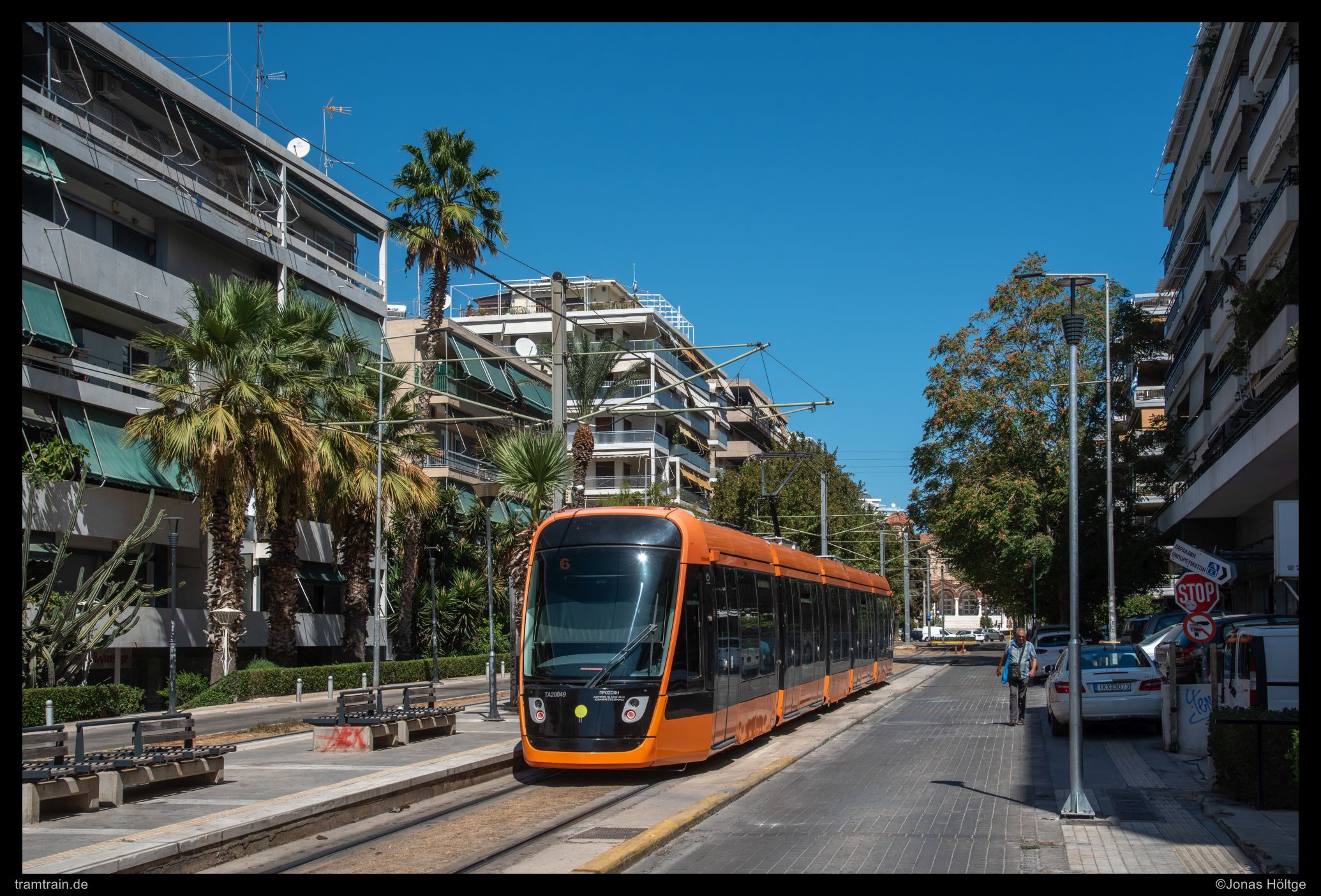 Zuerst versuchte ich es hinter der Haltestelle Agías Phōtrinés-Plateía mit einem Nachschuss. Doch dabei begleiteten Autos die Bahn direkt daneben. Daher wartete ich einen Kurs von vorne ab. Bei Wagen 20040 befanden sich zwar auch Autos auf der rechten Fahrbahn, diese störten aber nicht so immens, wie sie es beim Nachschuss zuvor getan hatten. So entstand ein erstes Bild an der langen Gerade, die die Straßenbahn hier in Straßenmitte bewältigte.