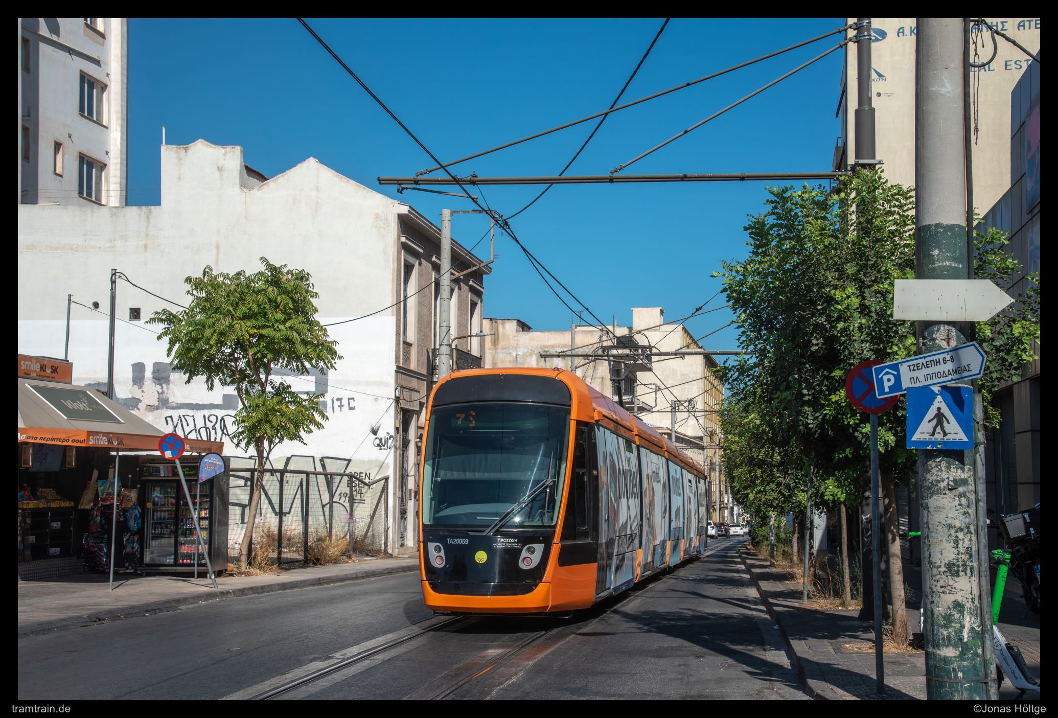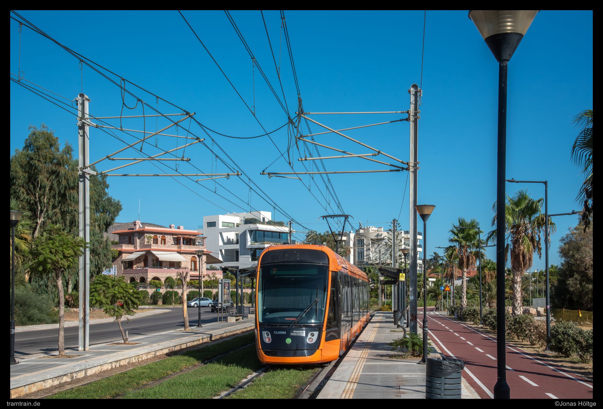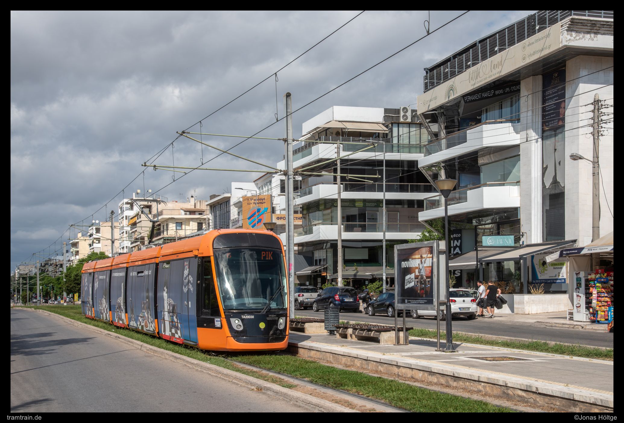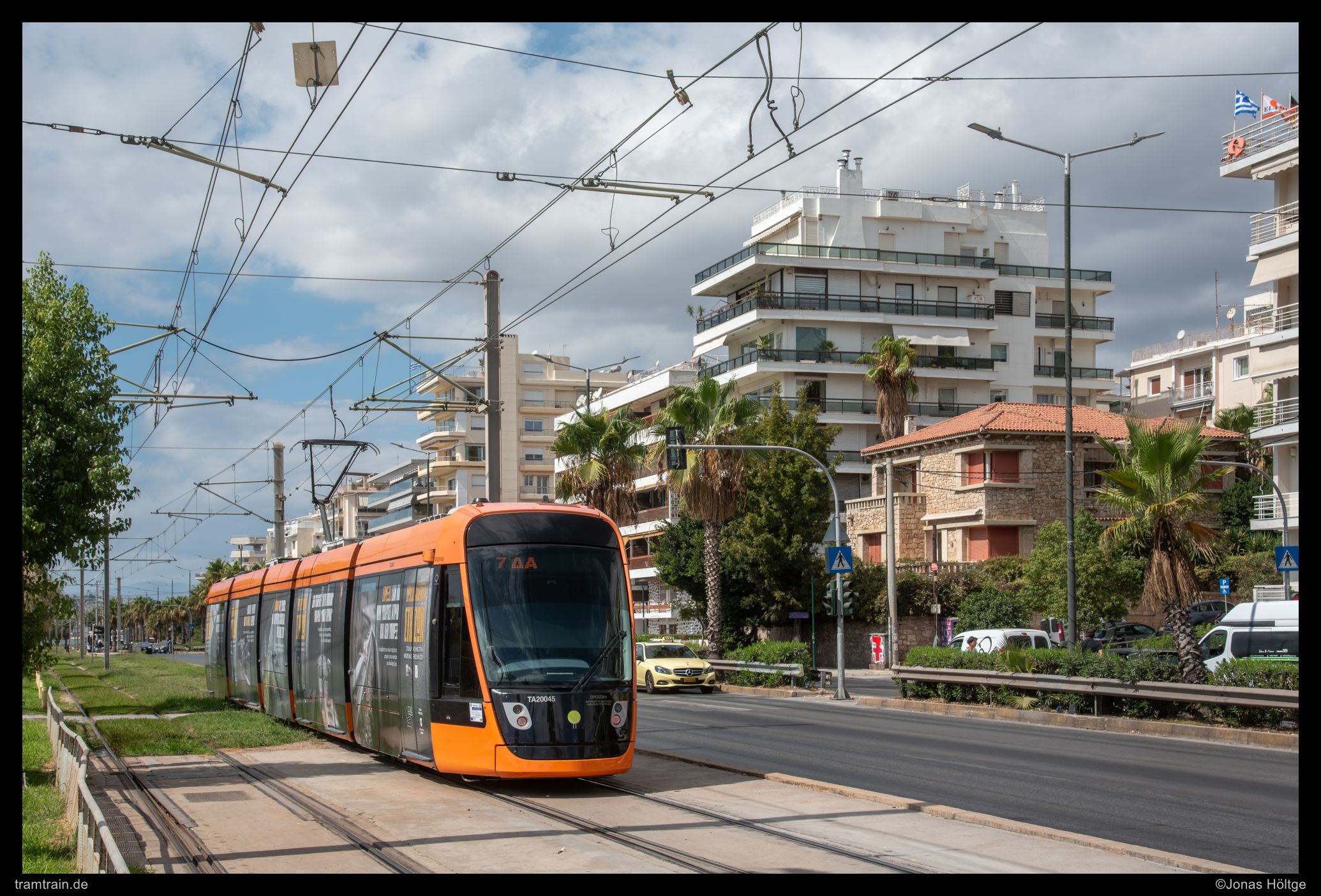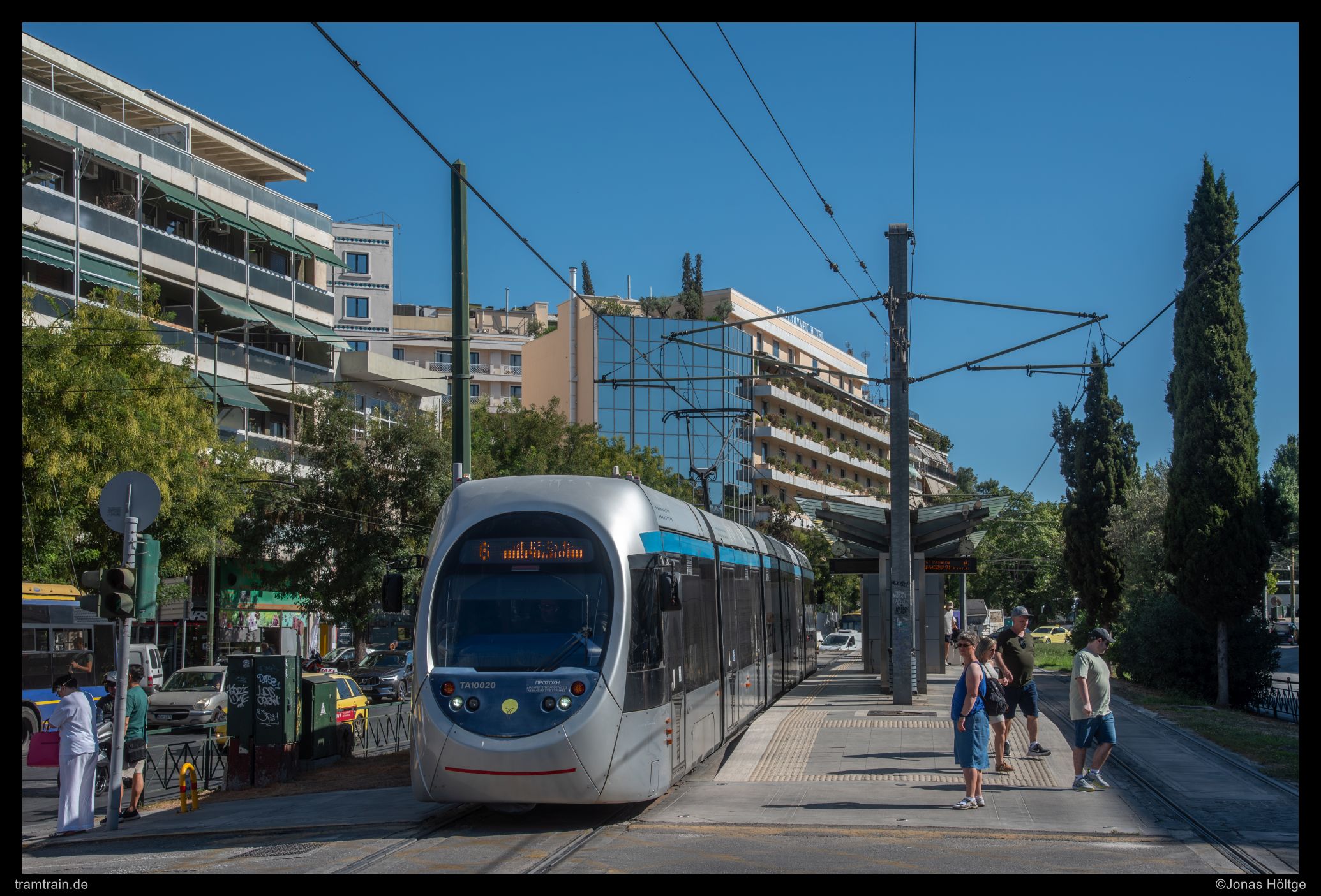 Zuerst versuchte ich es hinter der Haltestelle Agías Phōtrinés-Plateía mit einem Nachschuss. Doch dabei begleiteten Autos die Bahn direkt daneben. Daher wartete ich einen Kurs von vorne ab. Bei Wagen 20040 befanden sich zwar auch Autos auf der rechten Fahrbahn, diese störten aber nicht so immens, wie sie es beim Nachschuss zuvor getan hatten. So entstand ein erstes Bild an der langen Gerade, die die Straßenbahn hier in Straßenmitte bewältigte.