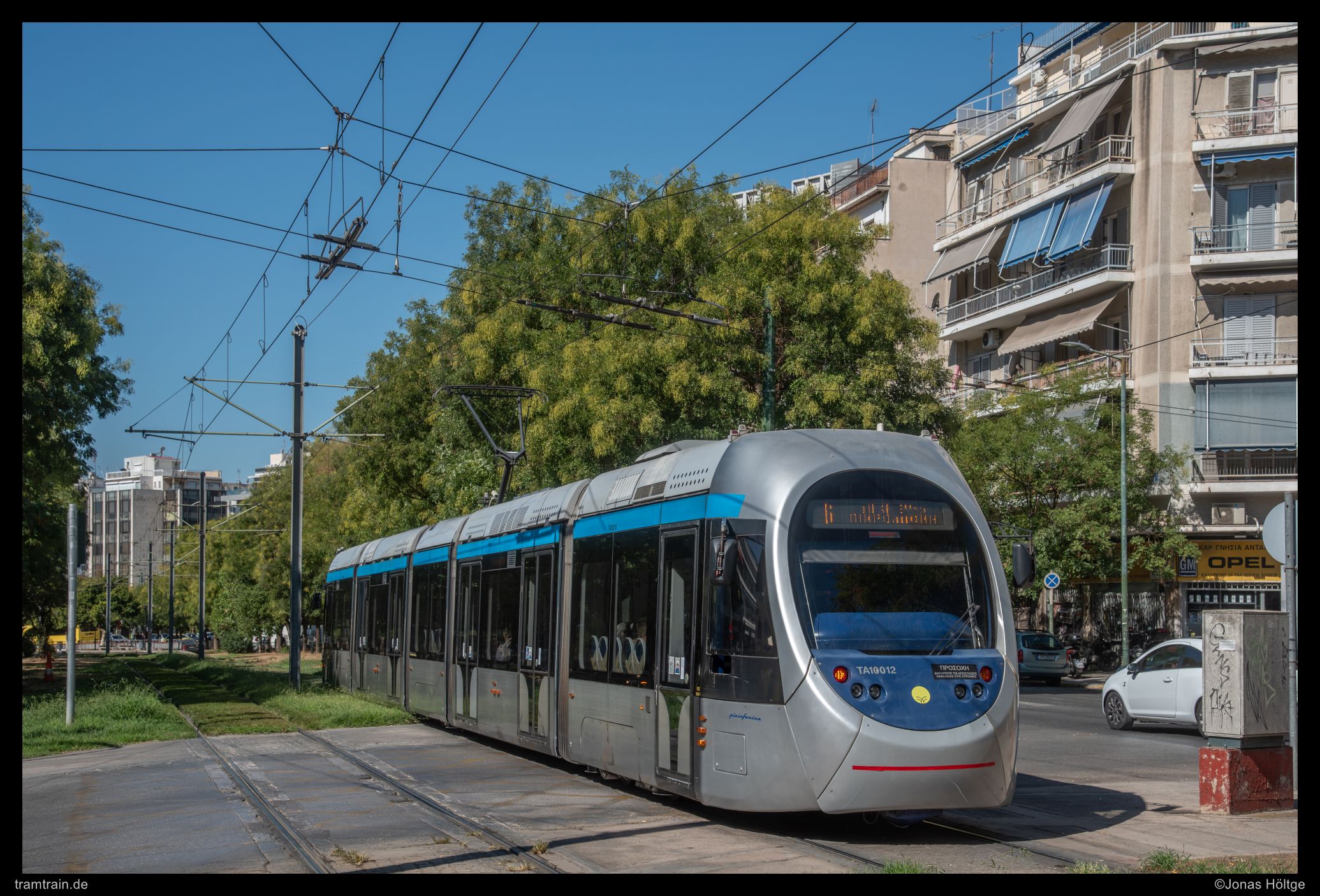 Wieder war ich ein paar Meter weitergekommen. Das Bild der Straße sah hier fast über die komplette Länge zum Verwechseln ähnlich aus. Immer war der Grünstreife in der Mitte der Straße, auf der die Straßenbahn verkehrte, während sich darum herum gleich wirkende Häuser entlang der Straße aufreihten. Dieses Mal war es Sirio 10012, der sich nahe der Station Agía Paraskeué im Bild präsentierte.