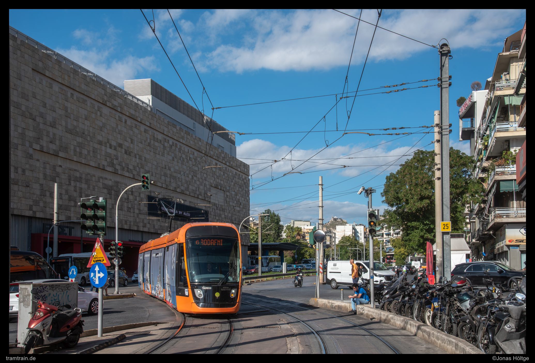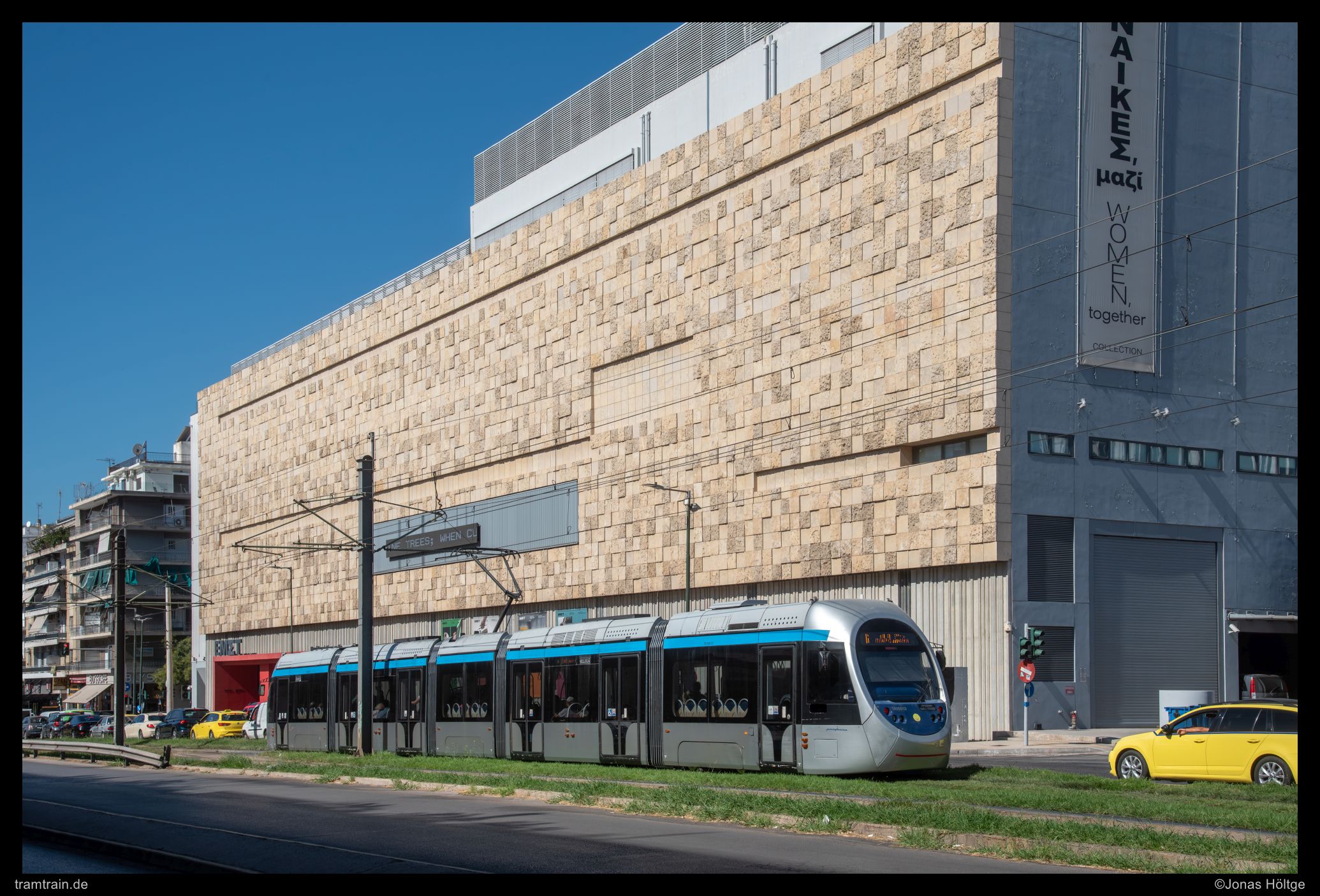 Die große Fassade des Nationalmuseums für zeitgenössische Kunst befand sich im Gegensatz zu Vorgestern nicht mehr im Licht. Ich hatte mich viel mehr für ein Bild an dieser Stelle entschieden, um einerseits das typische Bild der die Straßenbahn begleitenden Straße zu zeigen. Vollgestopft mit Autos präsentierte sich die Straße wie hier zu sehen fast immer. Andererseits war hier einer der kleinen Hügel zu erkennen, die sich an mehreren Stellen mitten in Athen erhoben. Wagen 20038 kreuzte gerade die Straße auf dem Weg zur Station Kasomoúlē.