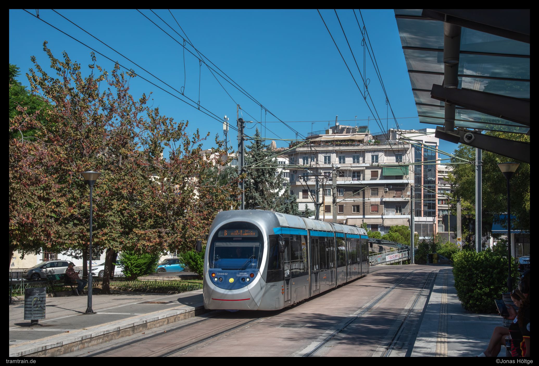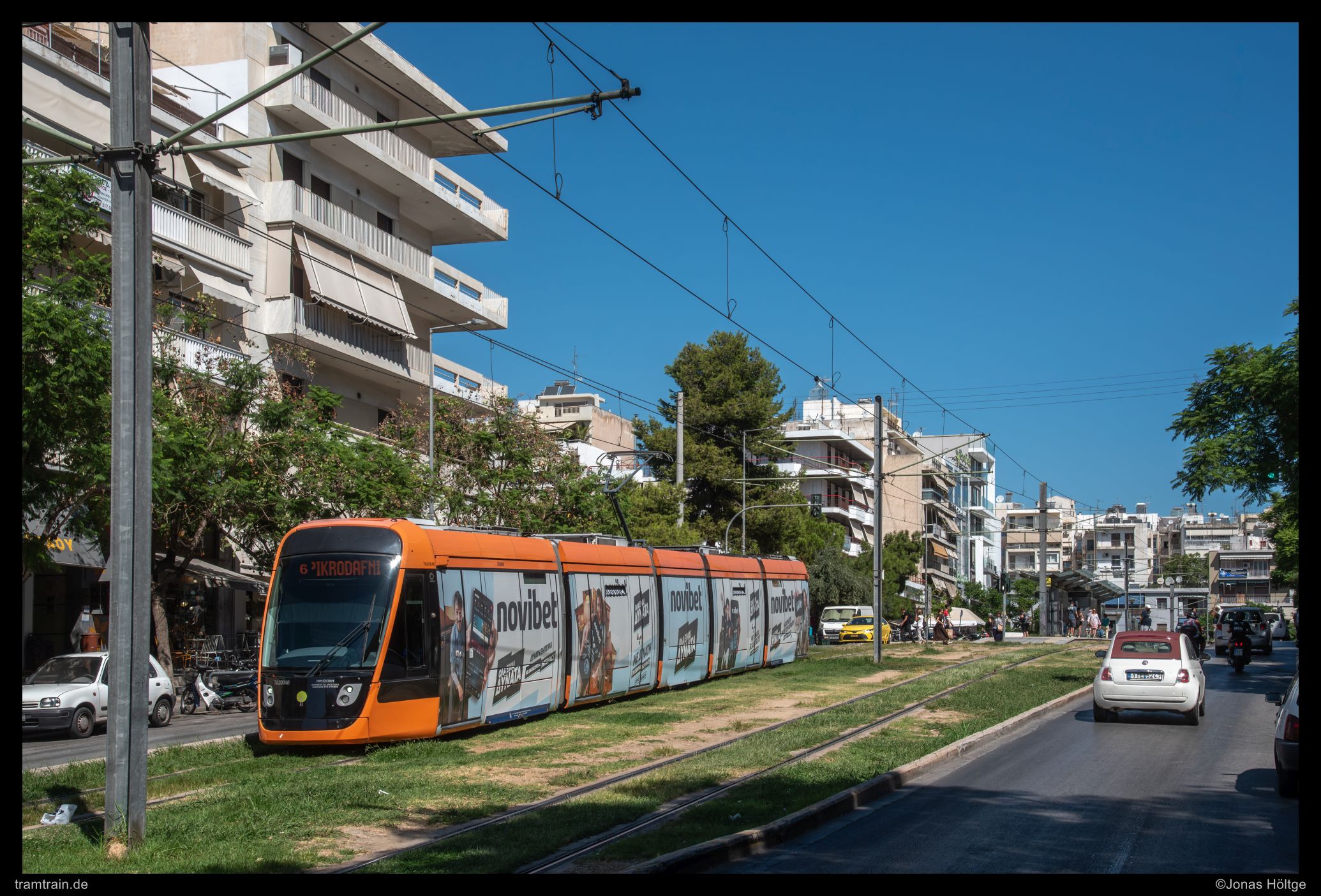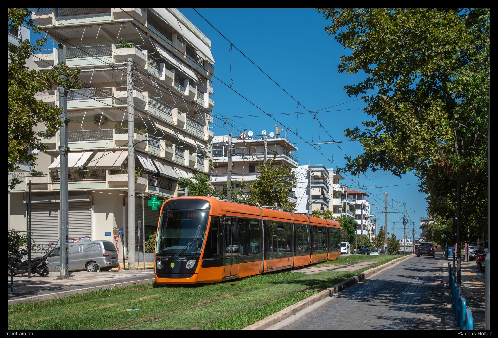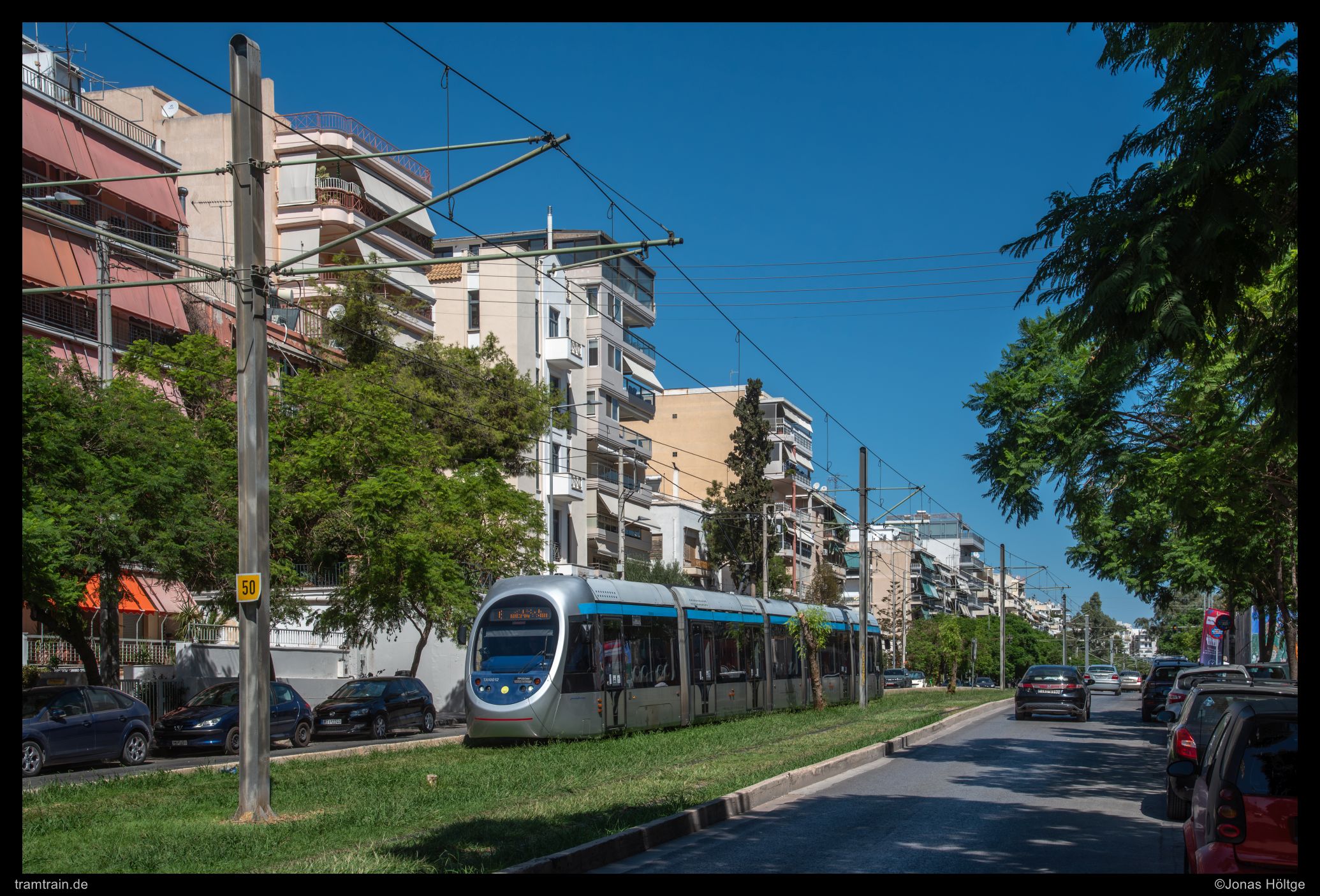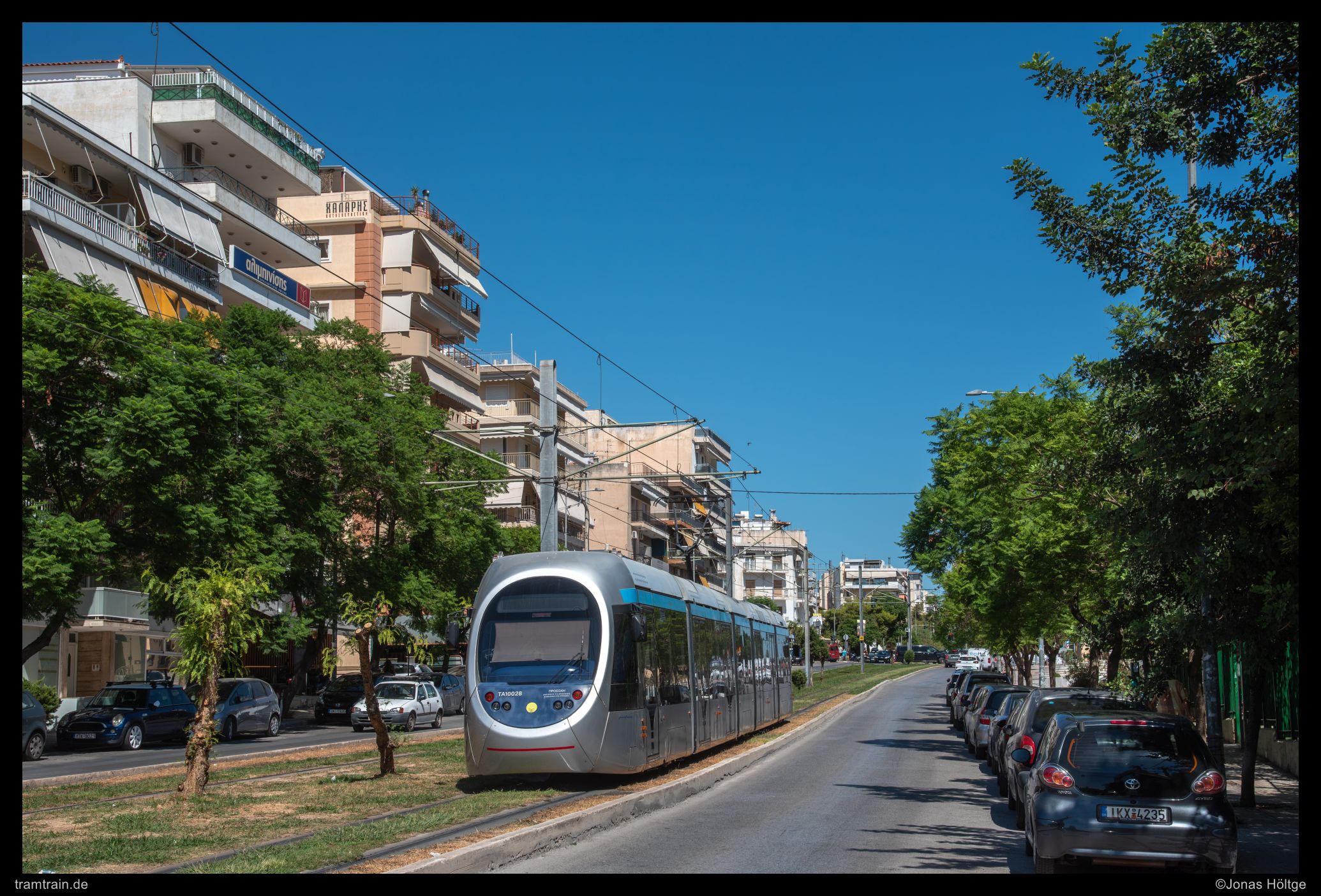Der weitere Streckenverlauf sah bei einem Blick auf die Karte nicht übermäßig spannend aus. Die Strecke würde wieder auf eine größere Straße einschwenken und in Mittellage verkehren. Daher wollte ich erstmal wieder ein wenig Strecke machen und wartete auf die nächste Bahn in die Richtung. Als die Bahn ein deutliches Stück zu spät ankam, war der Wagen schon gestopft voll. Eindrucksvoll wurde durch die Menschen, die mit uns zusammen zahlreich an der Station warteten, bewiesen, dass so eine Bahn zwar voll aussehen mag, aber noch lange nicht wirklich voll ist. Es wurde gedrängelt und komprimiert und irgendwann waren alle Personen in der Bahn und jetzt war ich mir sicher, dass nun wirklich nicht mehr Leute reinpassen würden. Diese Vermutung wurde bestätigt, als die wartenden Fahrgäste an den folgenden Stationen nicht mal mehr den Versuch unternahmen, einzusteigen, sondern gleich auf die nächste Bahn warteten. Ich hatte einen Stehplatz relativ mittig im Wagen abbekommen, was dazu führte, dass ich von der außen am Wagen vorbeiziehenden Umgebung nicht wirklich viel mitbekam. Daher musste ich irgendwann einfach auf gut Glück rausspringen und hoffen, dass ich jetzt hier ein Motiv vorfinden würde. Ein Motiv war zwar vorhanden, es wurde jedoch gleich zwei Bahnen hintereinander von Autos zugefahren, sodass ich das Bild als nicht umsetzbar aufgab und mich bis zur nächsten Station weiterbewegte. Hier begann ein Streckenabschnitt, bei dem sich die Bahn auf einem Grünstreifen in der Mitte einer immerhin nur zweispurigen Straße fortbewegte. Der Grünstreifen wurde zeitweise durch Bäume genau in der Mitte gesäumt und die Sonne stand gerade so, dass die Bahnen sich im richtigen Licht häufig hinter den Bäumen versteckten. Trotzdem setzte ich auch mit den Bäumen einige Bilder um und arbeitete mich Stück für Stück von der Station Agías Phōtrinés-Plateía bis zur Station Mēdeías-Mykálēs vor.