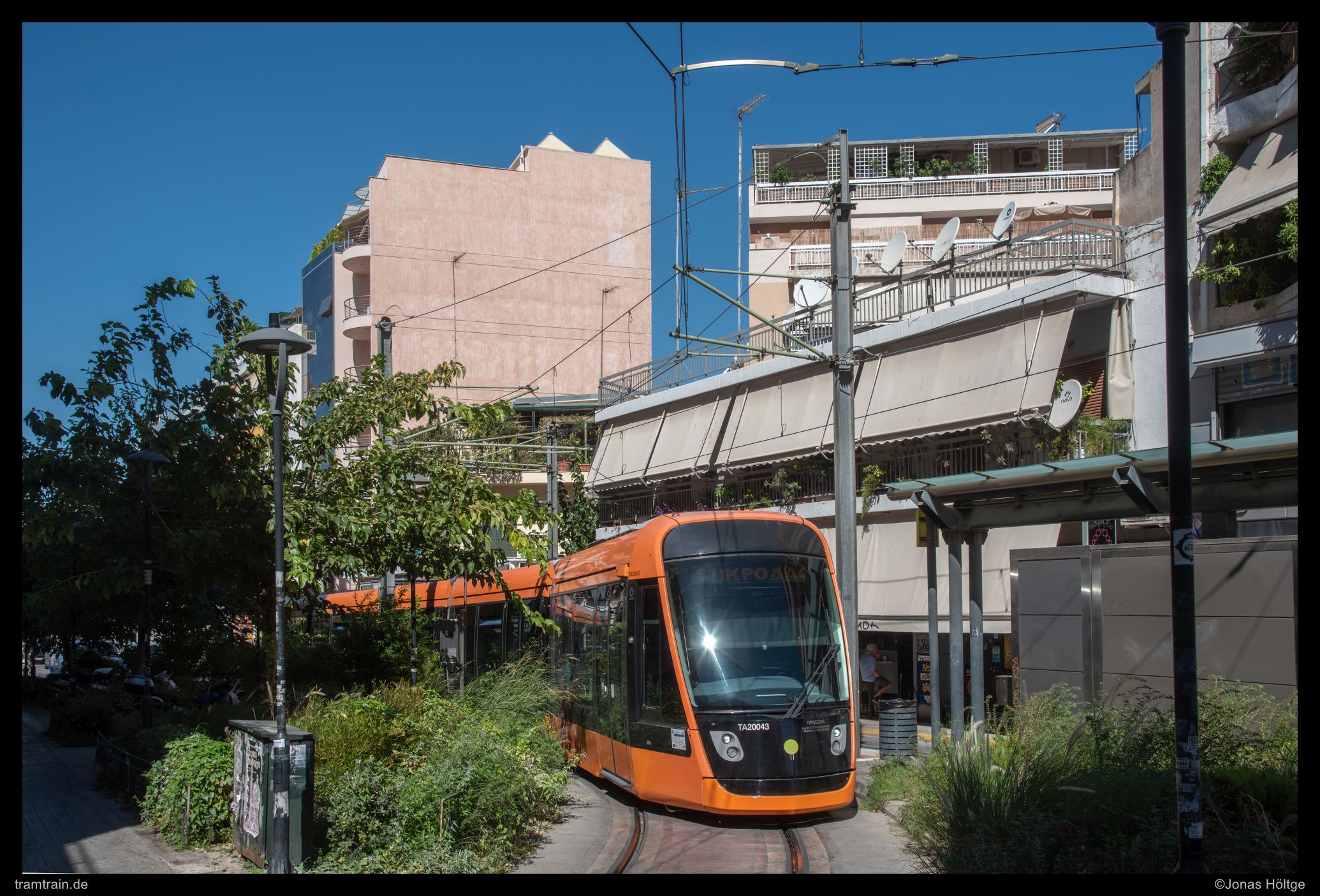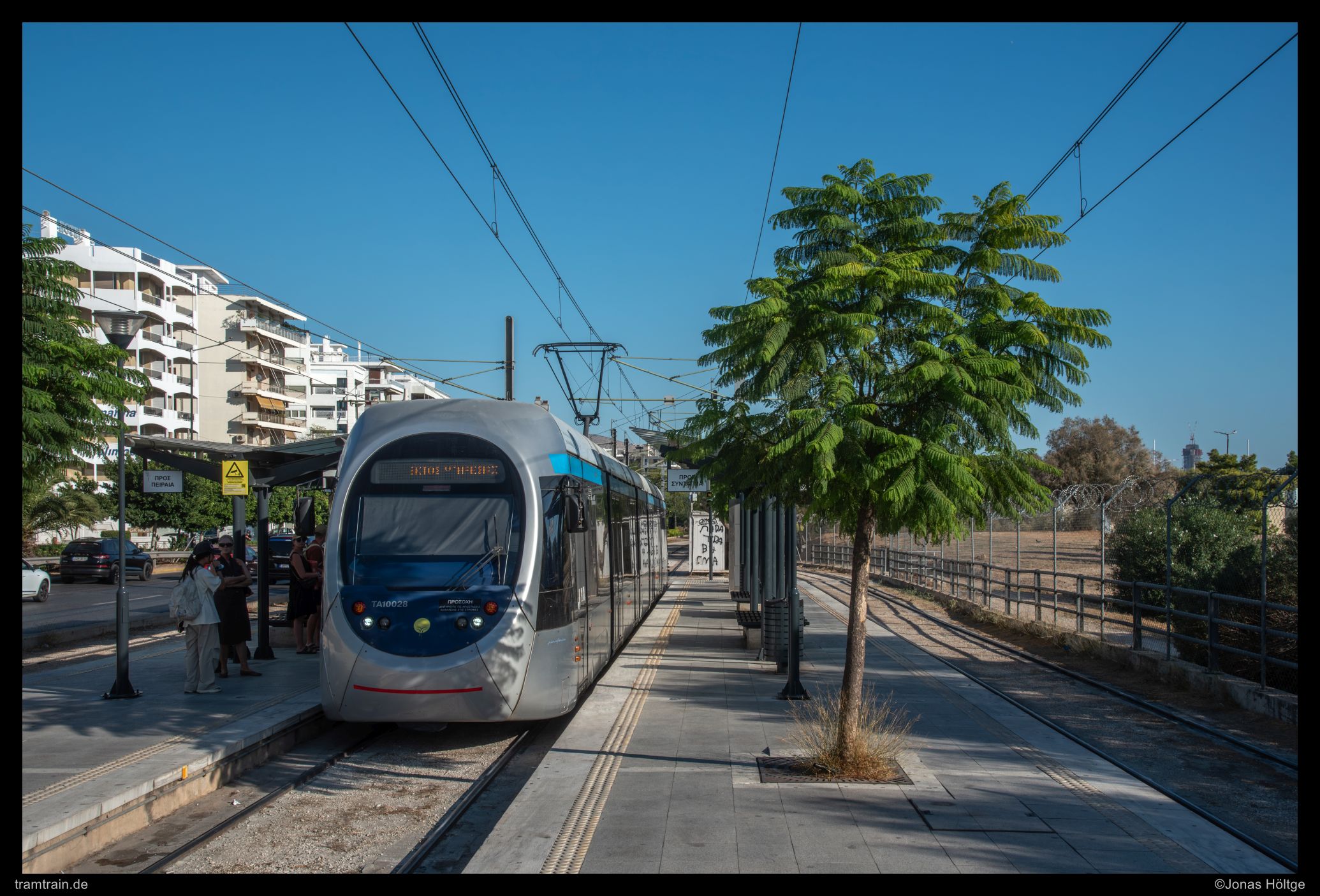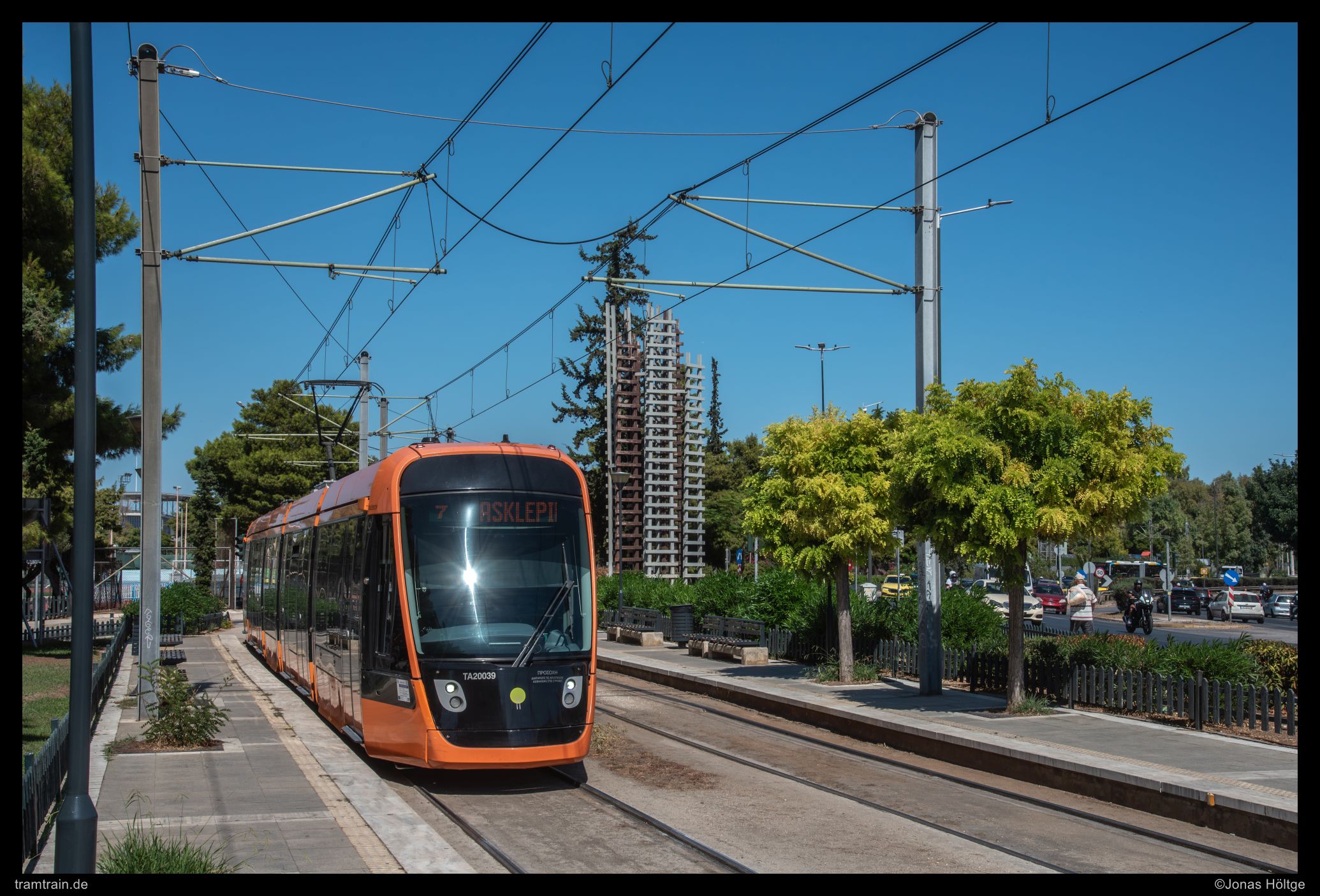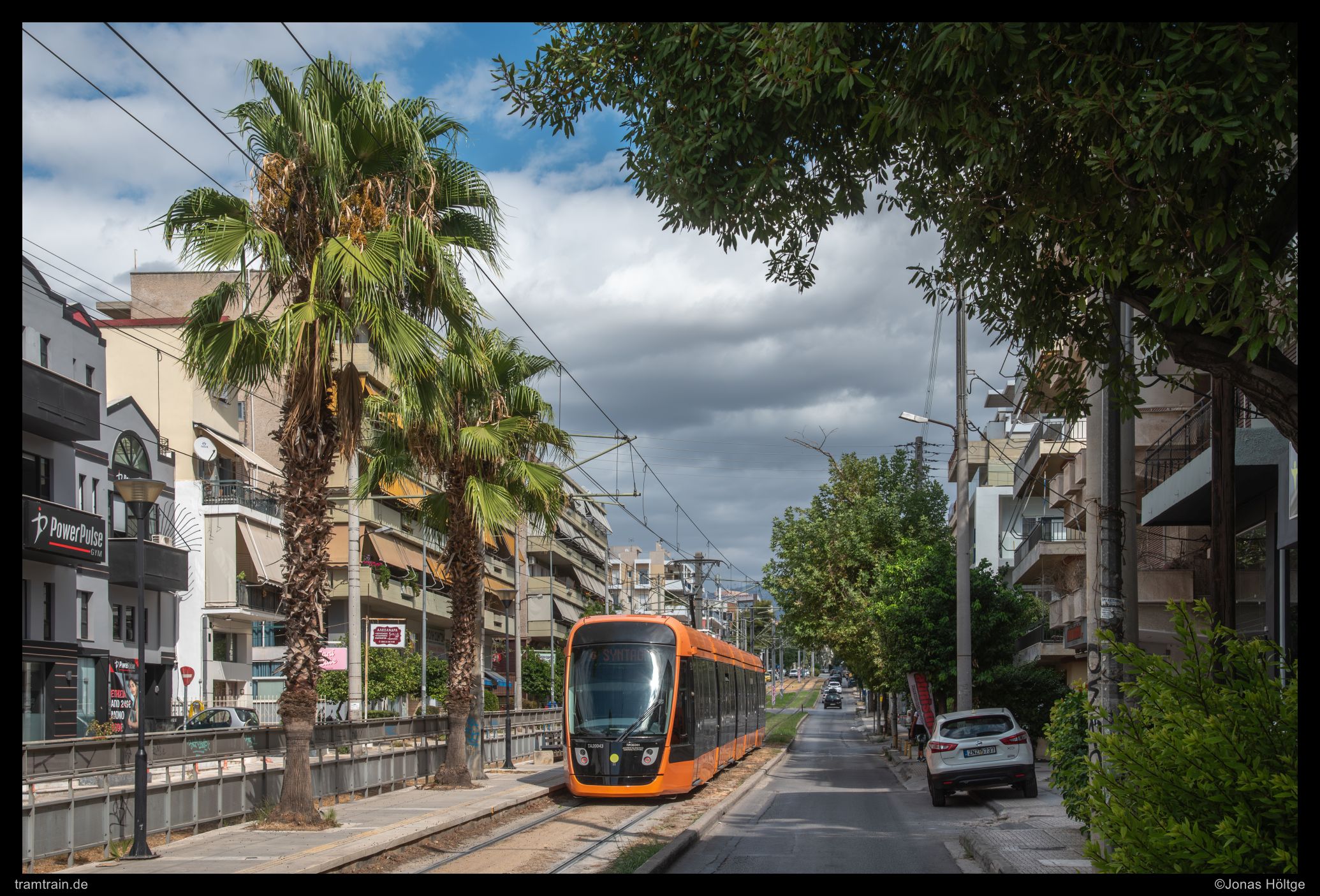 Der weitere Streckenverlauf sah bei einem Blick auf die Karte nicht übermäßig spannend aus. Die Strecke würde wieder auf eine größere Straße einschwenken und in Mittellage verkehren. Daher wollte ich erstmal wieder ein wenig Strecke machen und wartete auf die nächste Bahn in die Richtung. Als die Bahn ein deutliches Stück zu spät ankam, war der Wagen schon gestopft voll. Eindrucksvoll wurde durch die Menschen, die mit uns zusammen zahlreich an der Station warteten, bewiesen, dass so eine Bahn zwar voll aussehen mag, aber noch lange nicht wirklich voll ist. Es wurde gedrängelt und komprimiert und irgendwann waren alle Personen in der Bahn und jetzt war ich mir sicher, dass nun wirklich nicht mehr Leute reinpassen würden. Diese Vermutung wurde bestätigt, als die wartenden Fahrgäste an den folgenden Stationen nicht mal mehr den Versuch unternahmen, einzusteigen, sondern gleich auf die nächste Bahn warteten. Ich hatte einen Stehplatz relativ mittig im Wagen abbekommen, was dazu führte, dass ich von der außen am Wagen vorbeiziehenden Umgebung nicht wirklich viel mitbekam. Daher musste ich irgendwann einfach auf gut Glück rausspringen und hoffen, dass ich jetzt hier ein Motiv vorfinden würde. Ein Motiv war zwar vorhanden, es wurde jedoch gleich zwei Bahnen hintereinander von Autos zugefahren, sodass ich das Bild als nicht umsetzbar aufgab und mich bis zur nächsten Station weiterbewegte. Hier begann ein Streckenabschnitt, bei dem sich die Bahn auf einem Grünstreifen in der Mitte einer immerhin nur zweispurigen Straße fortbewegte. Der Grünstreifen wurde zeitweise durch Bäume genau in der Mitte gesäumt und die Sonne stand gerade so, dass die Bahnen sich im richtigen Licht häufig hinter den Bäumen versteckten. Trotzdem setzte ich auch mit den Bäumen einige Bilder um und arbeitete mich Stück für Stück von der Station Agías Phōtrinés-Plateía bis zur Station Mēdeías-Mykálēs vor.