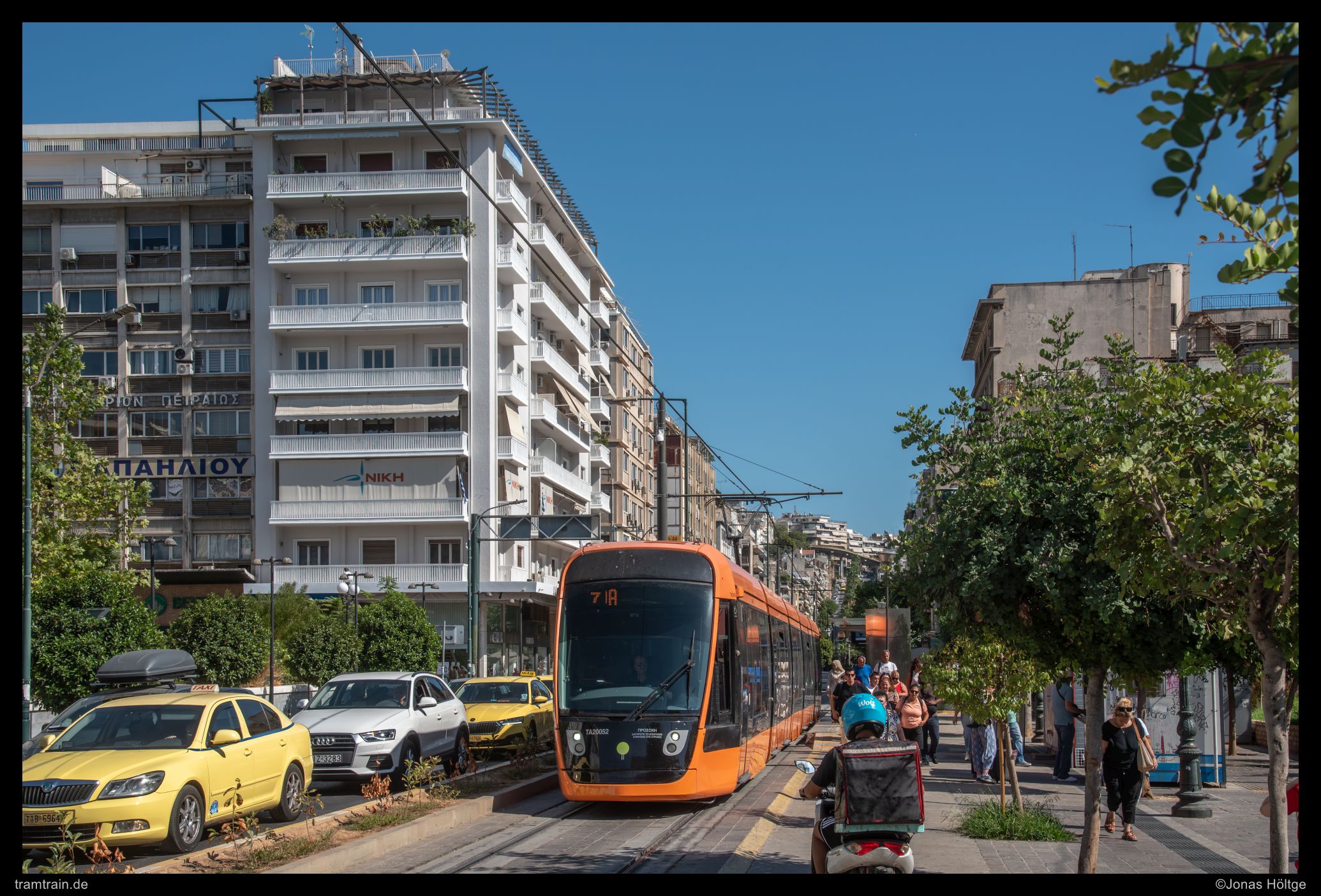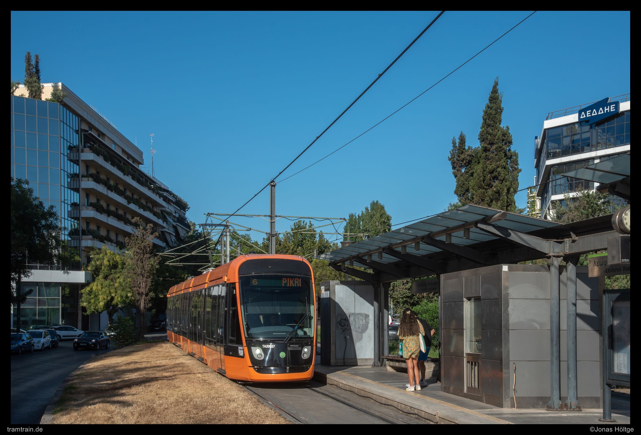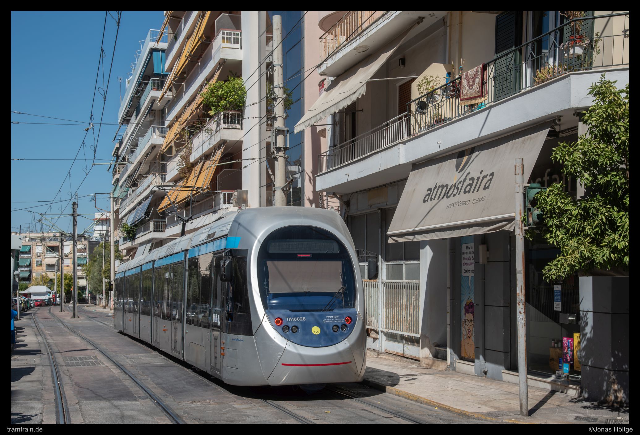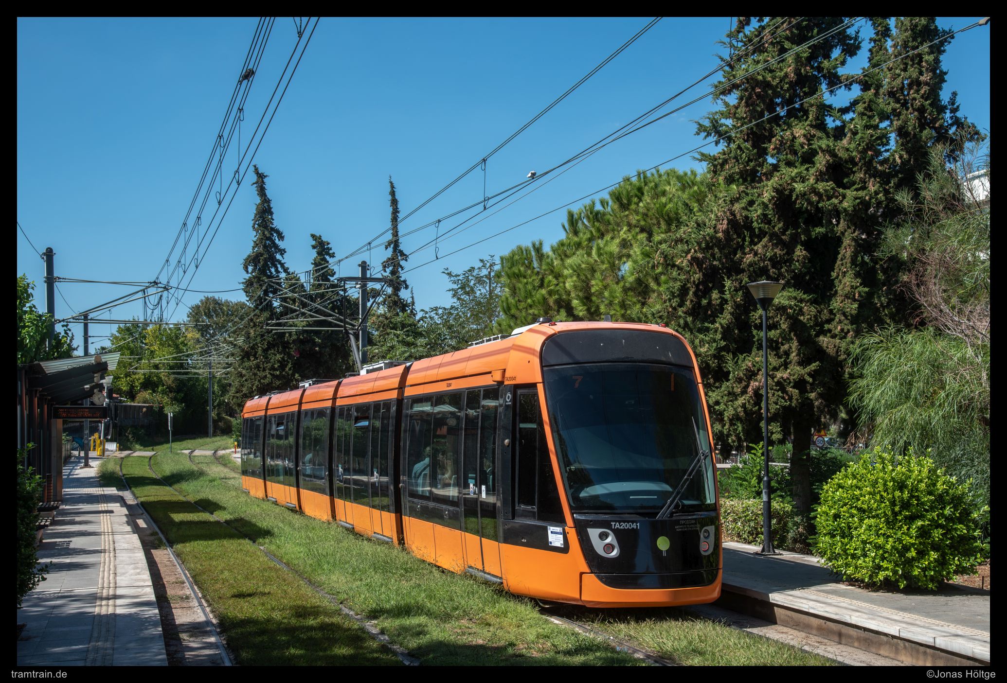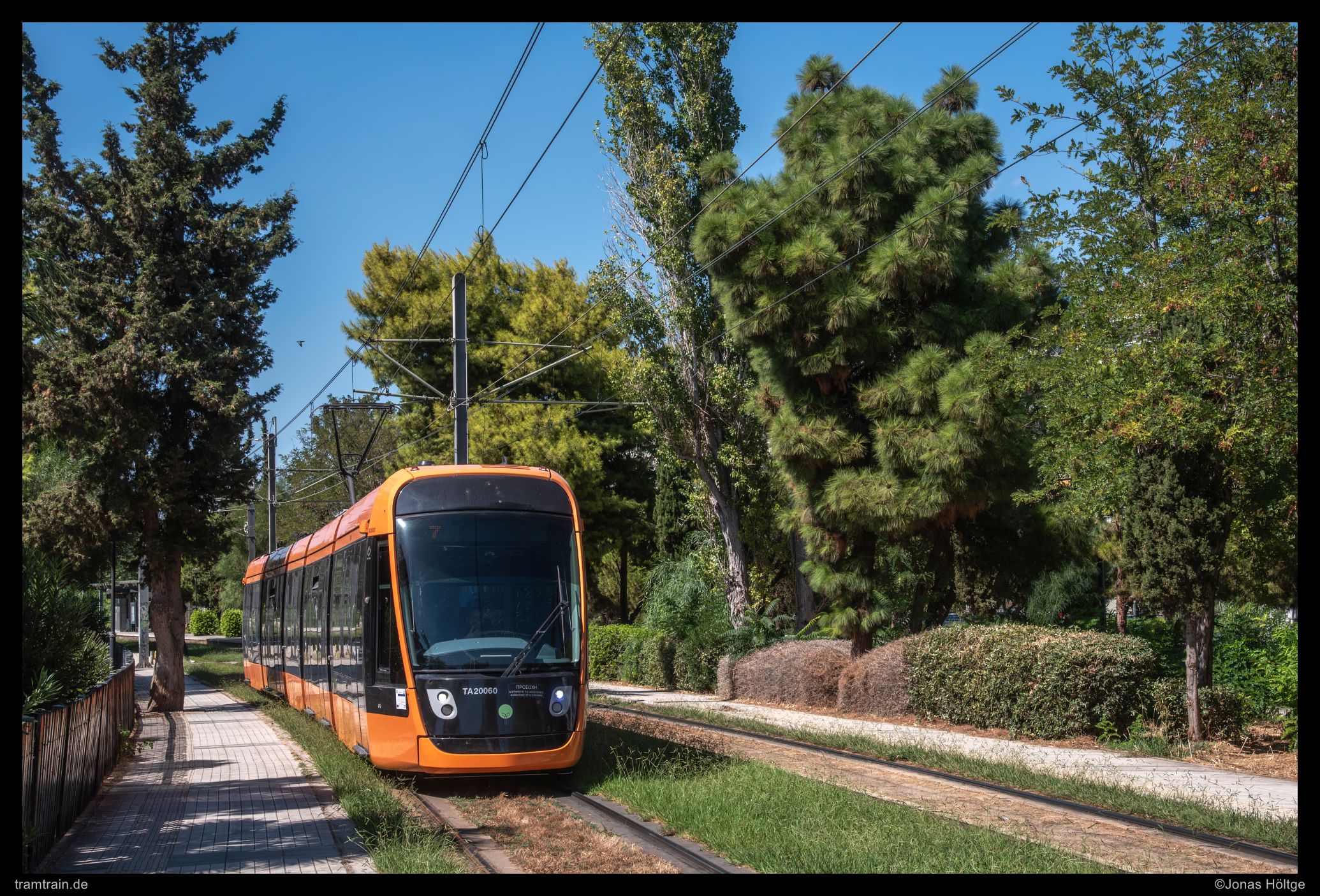 Der weitere Streckenverlauf sah bei einem Blick auf die Karte nicht übermäßig spannend aus. Die Strecke würde wieder auf eine größere Straße einschwenken und in Mittellage verkehren. Daher wollte ich erstmal wieder ein wenig Strecke machen und wartete auf die nächste Bahn in die Richtung. Als die Bahn ein deutliches Stück zu spät ankam, war der Wagen schon gestopft voll. Eindrucksvoll wurde durch die Menschen, die mit uns zusammen zahlreich an der Station warteten, bewiesen, dass so eine Bahn zwar voll aussehen mag, aber noch lange nicht wirklich voll ist. Es wurde gedrängelt und komprimiert und irgendwann waren alle Personen in der Bahn und jetzt war ich mir sicher, dass nun wirklich nicht mehr Leute reinpassen würden. Diese Vermutung wurde bestätigt, als die wartenden Fahrgäste an den folgenden Stationen nicht mal mehr den Versuch unternahmen, einzusteigen, sondern gleich auf die nächste Bahn warteten. Ich hatte einen Stehplatz relativ mittig im Wagen abbekommen, was dazu führte, dass ich von der außen am Wagen vorbeiziehenden Umgebung nicht wirklich viel mitbekam. Daher musste ich irgendwann einfach auf gut Glück rausspringen und hoffen, dass ich jetzt hier ein Motiv vorfinden würde. Ein Motiv war zwar vorhanden, es wurde jedoch gleich zwei Bahnen hintereinander von Autos zugefahren, sodass ich das Bild als nicht umsetzbar aufgab und mich bis zur nächsten Station weiterbewegte. Hier begann ein Streckenabschnitt, bei dem sich die Bahn auf einem Grünstreifen in der Mitte einer immerhin nur zweispurigen Straße fortbewegte. Der Grünstreifen wurde zeitweise durch Bäume genau in der Mitte gesäumt und die Sonne stand gerade so, dass die Bahnen sich im richtigen Licht häufig hinter den Bäumen versteckten. Trotzdem setzte ich auch mit den Bäumen einige Bilder um und arbeitete mich Stück für Stück von der Station Agías Phōtrinés-Plateía bis zur Station Mēdeías-Mykálēs vor.