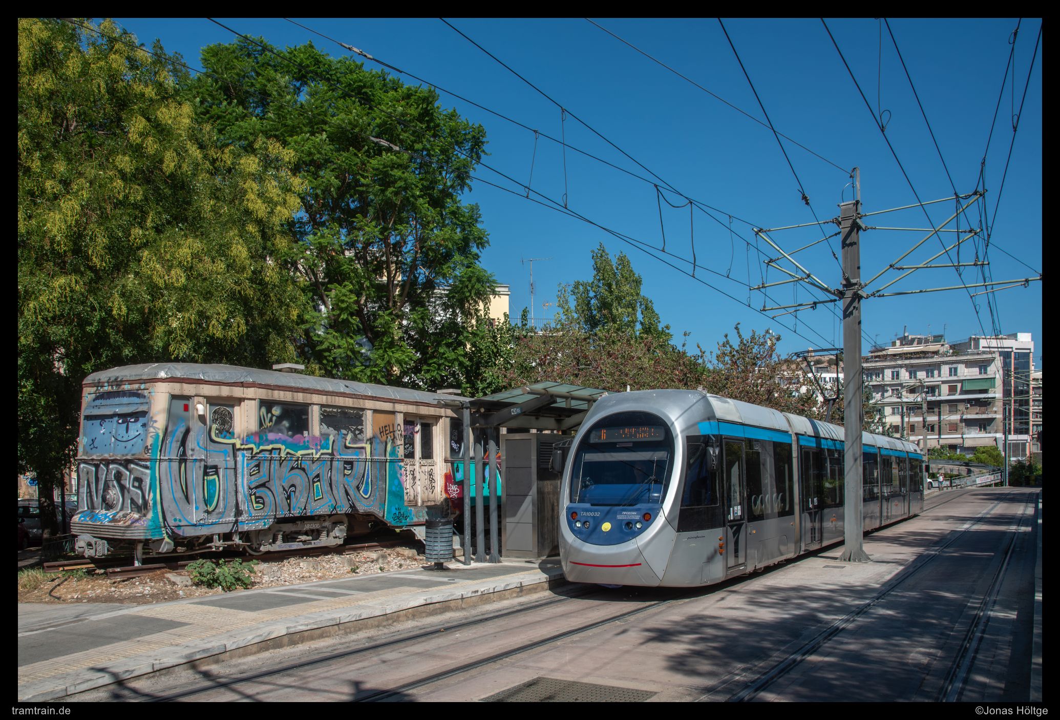 Eigentlich wollte ich nach dem Bild direkt an der Station in den Wagen einsteigen um weiter zu fahren und mich ein wenig durch die Klimaanlage abkühlen lassen zu können. Doch der Wagen fuhr bis ganz nach vorne am Bahnsteig durch und hielt erst dort an. Zum Laufen war es mir entschieden zu warm, weshalb ich mich wohl oder übel damit abfinden musste, erst den nächsten Kurs nehmen zu können. ich flüchtete mich von der sonnigen Haltestelle auf die andere Straßenseite in den Häuserschatten, um die Wartezeit zu überbrücken. Dadurch konnte ich zumindest den entgegenkommenden Wagen noch als Nachschuss an der Station festhalten. In der Folge zogen sich die angezeigten acht Minuten bis zur nächsten Bahn in Richtung Pikrodáphnē eine gefühlte Ewigkeit hin. Als die Bahn endlich kam, sah ich zu, dass ich schnellstmöglich in den klimatisierten Wagen kam, um mich abzukühlen. Viel Zeit blieb mir dafür jedoch nicht, denn schon drei Stationen nach der Station Mousōn an der Panagitsa of Palaio Phalero befand sich die Endstation der Linie 6. Zunächst zweigte die Linie 6 nach der Station auf die Linie 7 ein. Die zweite Linie des Betriebes ging im Prinzip konstant von Piräus bis zur Endstation Asklipiio Voulas in Wassernähe entlang und schaffte es so nicht mal in die Nähe der Athener Innenstadt. Die Linie 6 folgt dem Fahrtverlauf der Linie 7 nur zwei Stationen und fand bereits an der Station Pikrodáphnē ihre Endstation. Dort endet die Linie 6 auf einem Mittelgleis in der Mitte der Station, während die Linie 7 noch ein ganzes Stück weitergeht. Zwangsläufig musste ich an dieser Station die Straßenbahn also verlassen. Ich lichtete noch einen durchfahrenden Kurs der Linie 7 ab, bevor ich mir weitere Gedanken darüber machte, wo ich als Nächstes hinfahren wollte.