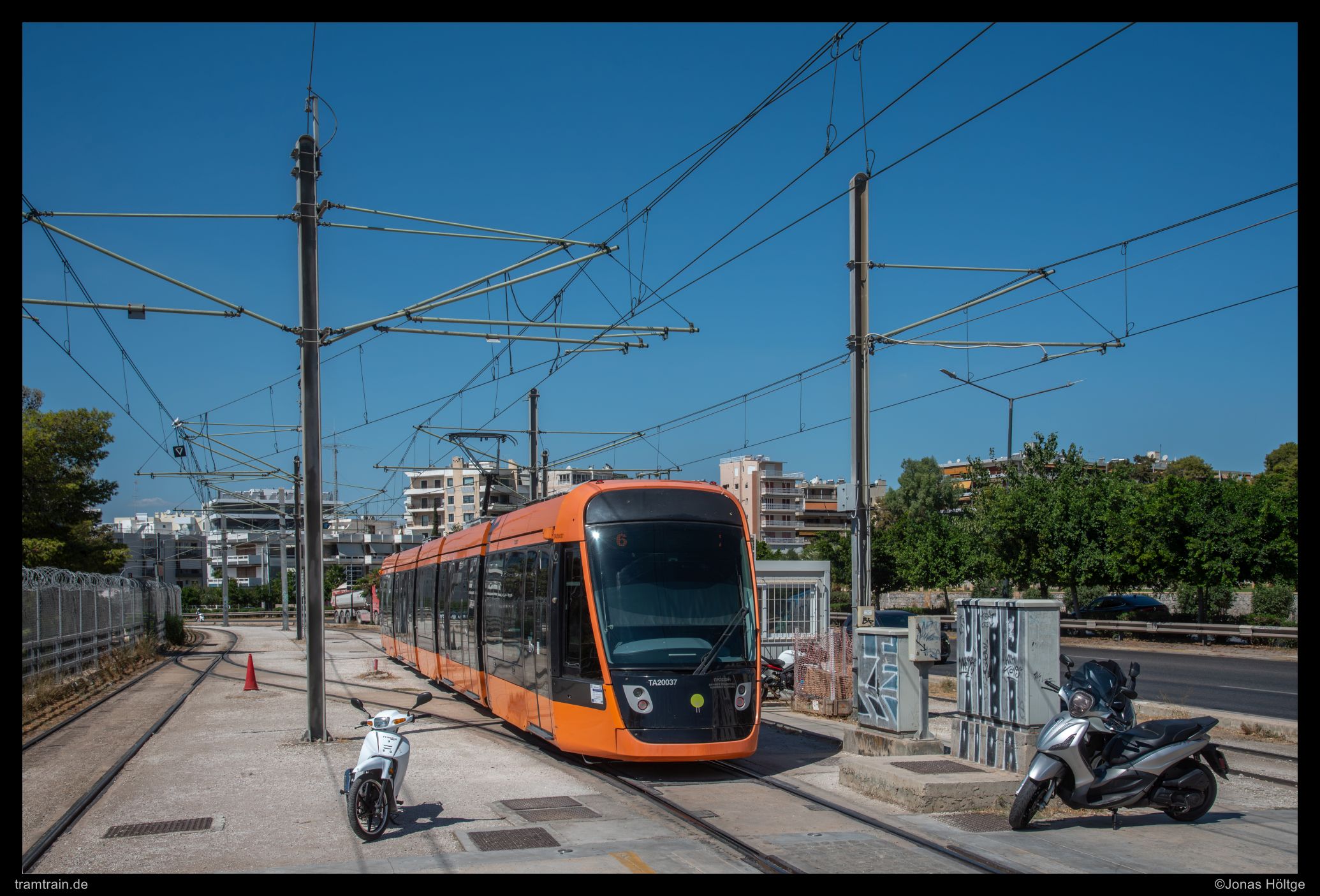 Die Station Pikrodáphnē war motivtechnisch eigentlich ein Totalausfall. Links erhob sich ein Stacheldrahtzaun, um ein Privatgelände abzusperren, rechts von der Strecke befand sich eine riesige Straße, auf der fast durchgehend ohrenbetäubender Verkehrslärm herrschte. Auch die Strecke dazwischen war nicht wirklich schön. Das einzige, was mich hier zu einem Bild verleitete, waren die abgestellten Roller. Besonders der Roller links hatte zwischen den beiden Gleisen der Straßenbahn eine sehr interessante Parkmöglichkeit gefunden, wobei dort sicherlich noch einige Roller mehr hingepasst hätten.