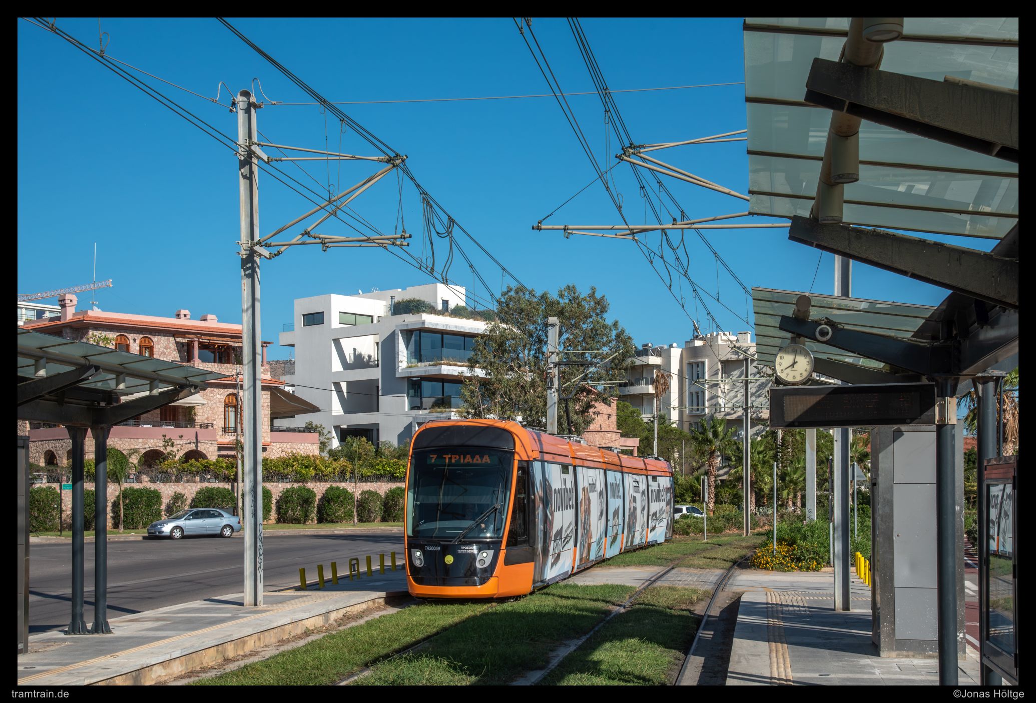 Die Linie 6 hatte ich nun einmal auf kompletter Länger erkundet. Jetzt blieb als nächstes Ziel eigentlich nur noch die Linie 7 übrig. Von hieraus hatte ich die freie Wahl, in welche Richtung ich zuerst aufbrechen wollte. In die eine Richtung ging die Strecke noch unzählige Stationen nah an der Küstenlinie entlang bis zur Endstation Asklipiio Voulas. In die andere Richtung war es nicht mehr ganz so weit, bis die Strecke Piräus erreichte. Dort wurde ein großes eingleisiges Viereck einmal durch Piräus gefahren und somit die Endstation gespart. Diese Seite sah mir auf den ersten Blick interessanter aus. Daher entschied ich mich dazu, in Richtung Piräus aufzubrechen und einfach mal zu gucken, was sich dort so ergeben würde. Zunächst arbeitete ich mich Stück für Stück bis zur Station Trokanteró vor. Über die gesamte Streckenlänge wurde die Strecke hier von der bereits angesprochenen großen Straße begleitet. Dadurch ergaben sich nicht sonderlich viele Motive abseits der Stationen und ich blieb bei all meinen Bildern in Haltestellennähe. Dort fanden sich zumindest hin und wieder einige grünere Abschnitte oder interessante Gebilde. Einzig das Warten an den Haltestellen wurde bei den Temperaturen immer zur Qual. Während ich bei der Linie 6 zunächst noch Angst gehabt hatte, gar keinen werbefreien Alstom-Wagen ablichten zu können, da insgesamt nicht so viele Wagen der Serie unterwegs waren, hatte sich das Bild auf der Linie 7 klar geändert. Diese Linie wurde typenrein mit den Citadis 305 bedient und es waren überhaupt keine Wagen von Ansaldo Breda unterwegs, obwohl davon insgesamt zehn Fahrzeuge mehr vorhanden sind.