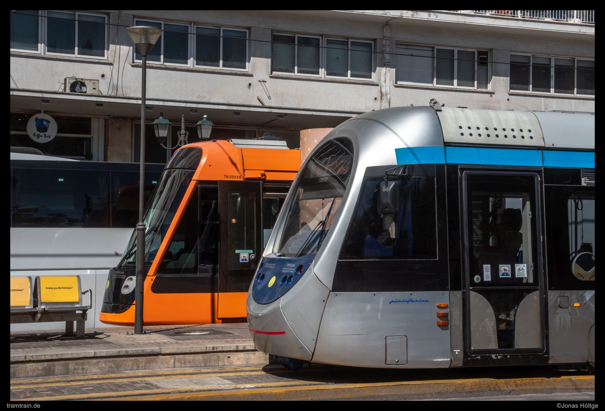 Der heutige Tag stand eigentlich komplett im Fokus für die zahlreichen kulturellen Highlights, die Athen zu bieten hatte. Aus diesem Grund rückte die Straßenbahn heute komplett in den Hintergrund und es sollten eigentlich keine Bilder entstehen. Zu einem Bild ließ ich mich letztendlich aber doch verleiten. Wir befanden uns ohnehin im Moment in der Nähe des Syntagma, weshalb es unweigerlich zu einer Begegnung mit der Straßenbahn kam. Als ich einen Blick zur Endstation Syntagma warf, fielen mir direkt die beiden Wagen ins Auge, die dort in der Station standen. Es handelte sich in diesem Fall um beide vorhandenen Fahrzeugtypen. Diese Chance wollte ich nutzen, um die Fahrzeuge einmal nebeneinander abzulichten. Daher begab ich mich zur Station und nahm zuerst eine seitliche Aufnahme der beiden Fahrzeugköpfe auf. Bevor ich eine Perspektive mit den vollständigen Wagen umsetzen konnte, kam die nächste Welle an Autos ins Bild gefahren, während der auch einer der Wagen die Station verließ und ein weiteres Bild zunichte machte. Somit blieb es am heutigen Tag bei nur diesem einen Bild der Straßenbahn.