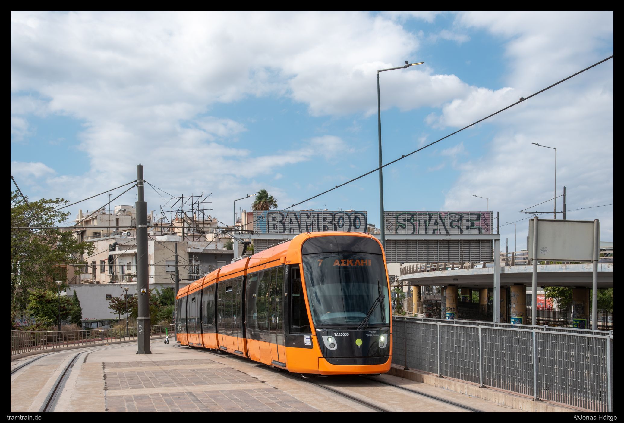 Die Station Trokanteró stellte die letzte Station vor dem noch deutlich unfotogeneren Streckenabschnitt bis Piräus dar. Hier war die Strecke wieder zurück an die Straße gelangt und die Sonne stand gefährlich nah an der Gleisachse. Für das ohnehin nur steil umzusetzende Bild von Wagen 20039 war das aber unerheblich und ich hielt den Wagen neben dem interessanten Konstrukt fest, dass sich neben der Strecke erhob. Eine Bedeutung für diese von mir interpretierte Leiterkonstruktion fand ich nicht heraus.