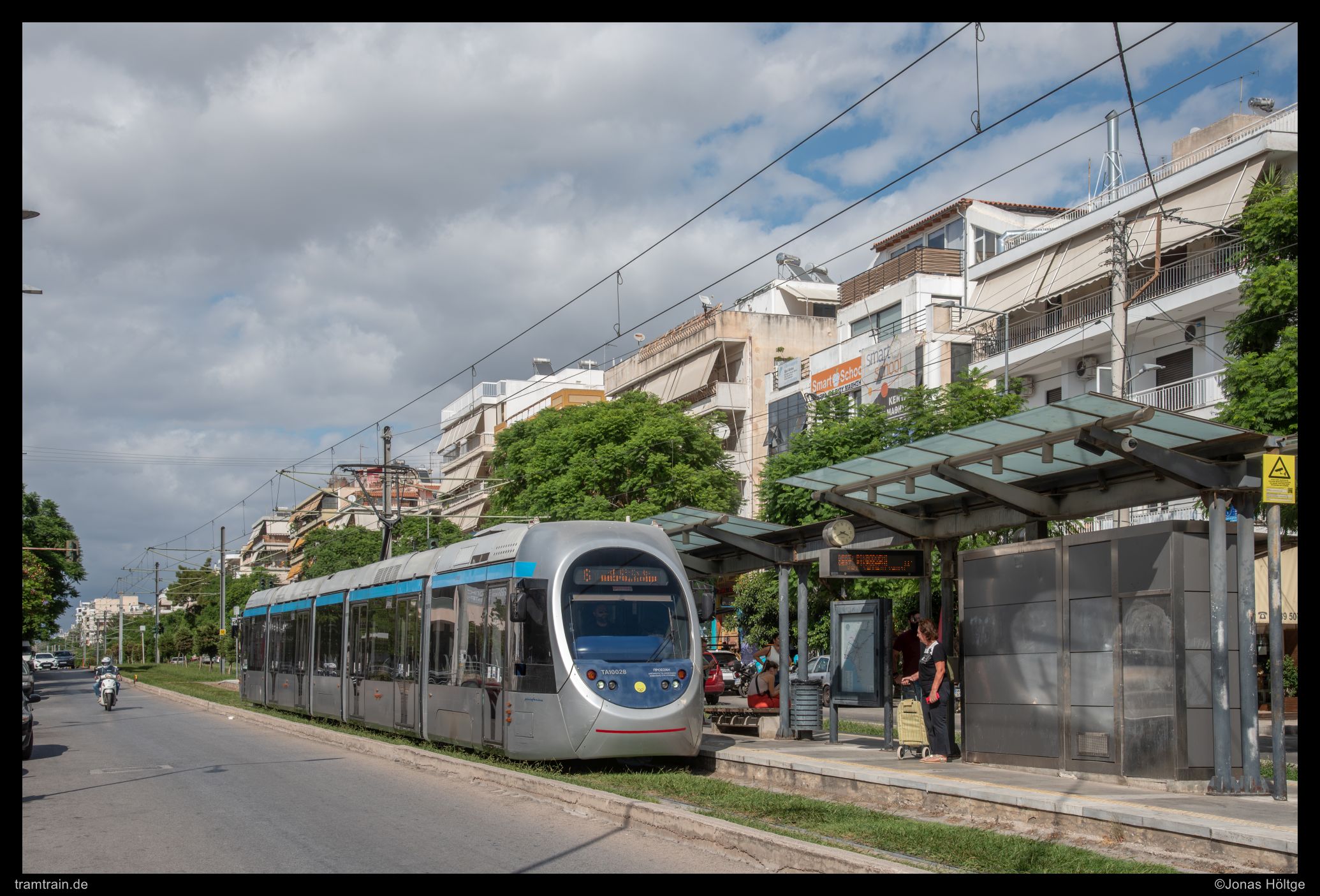 An dem Straßenbild hatte sich auch an der nächsten Station nicht wirklich viel geändert. Noch immer wurde die Straße von allesamt gleich wirkenden Häusern und Baumalleen begleitet und auch die Straßenbahn verkehrte weiterhin in Mittellage und ausgestattet mit Mittelbahnsteigen. Einziger Unterschied war der Ansaldo Breda Sirio 10028, der anstelle eines Alstoms in die Station Euangeliké Scholé einfuhr.