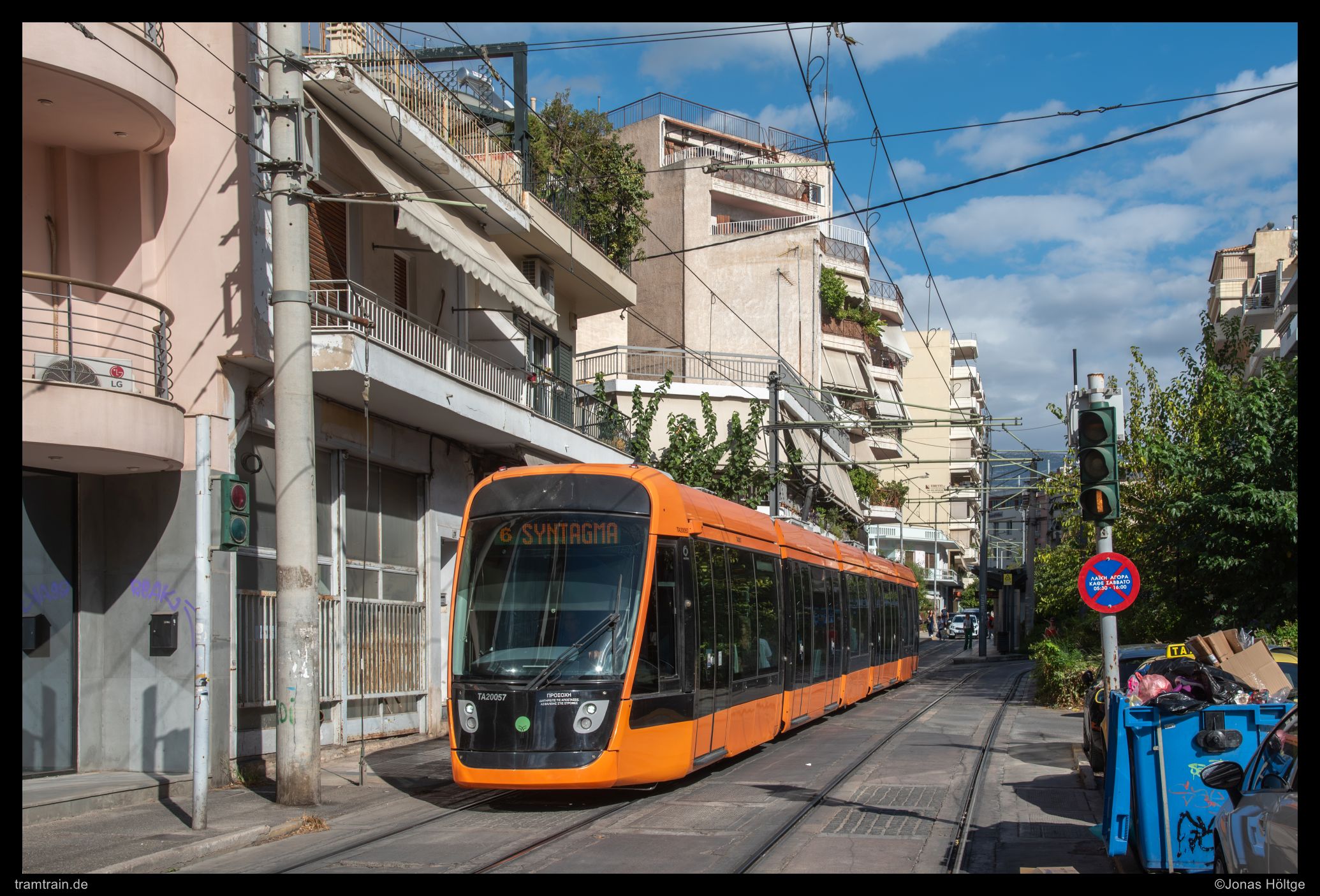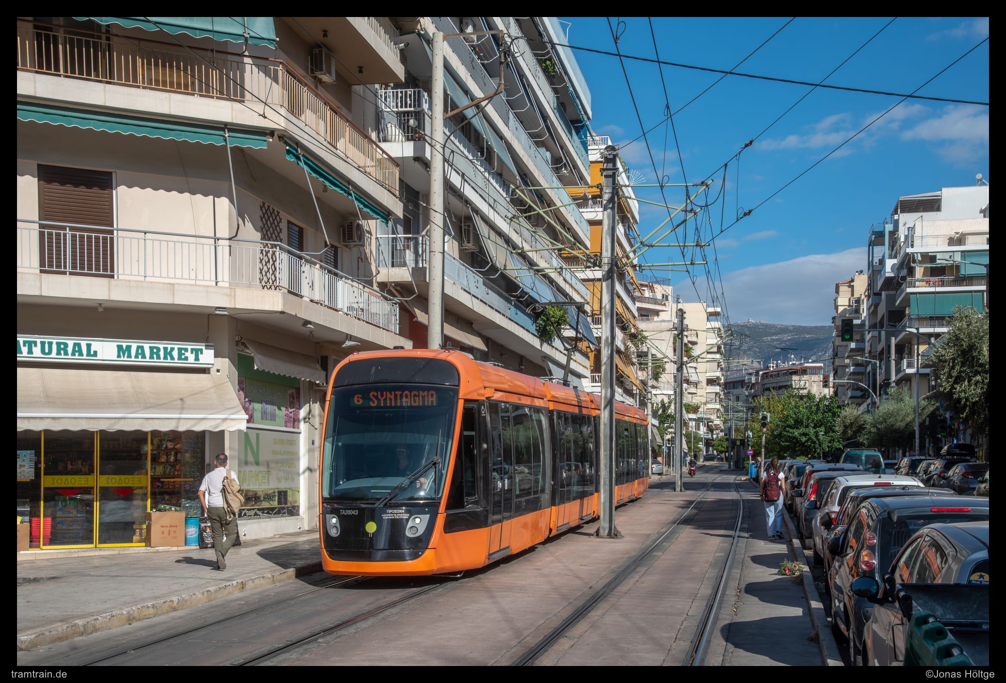 Eigentlich hatte ich schon bei dem vorherigen Bild versucht, ein wenig von den Athen umgebenden Bergen im Bild unterzubringen. Bei der letzten Perspektive hatten sich die Häuser jedoch größtenteils vor die Berge geschoben. Nur ein paar Meter weiter die Straße herunter hatte sich das Bild etwas verändert und hinter dem Häusermeer war ein Teil der sich um die Stadt erhebenden Berge aufgetaucht. Alstom 20043 folgte nur zehn Minuten nach dem letzten Wagen als Kurs der Linie 6.